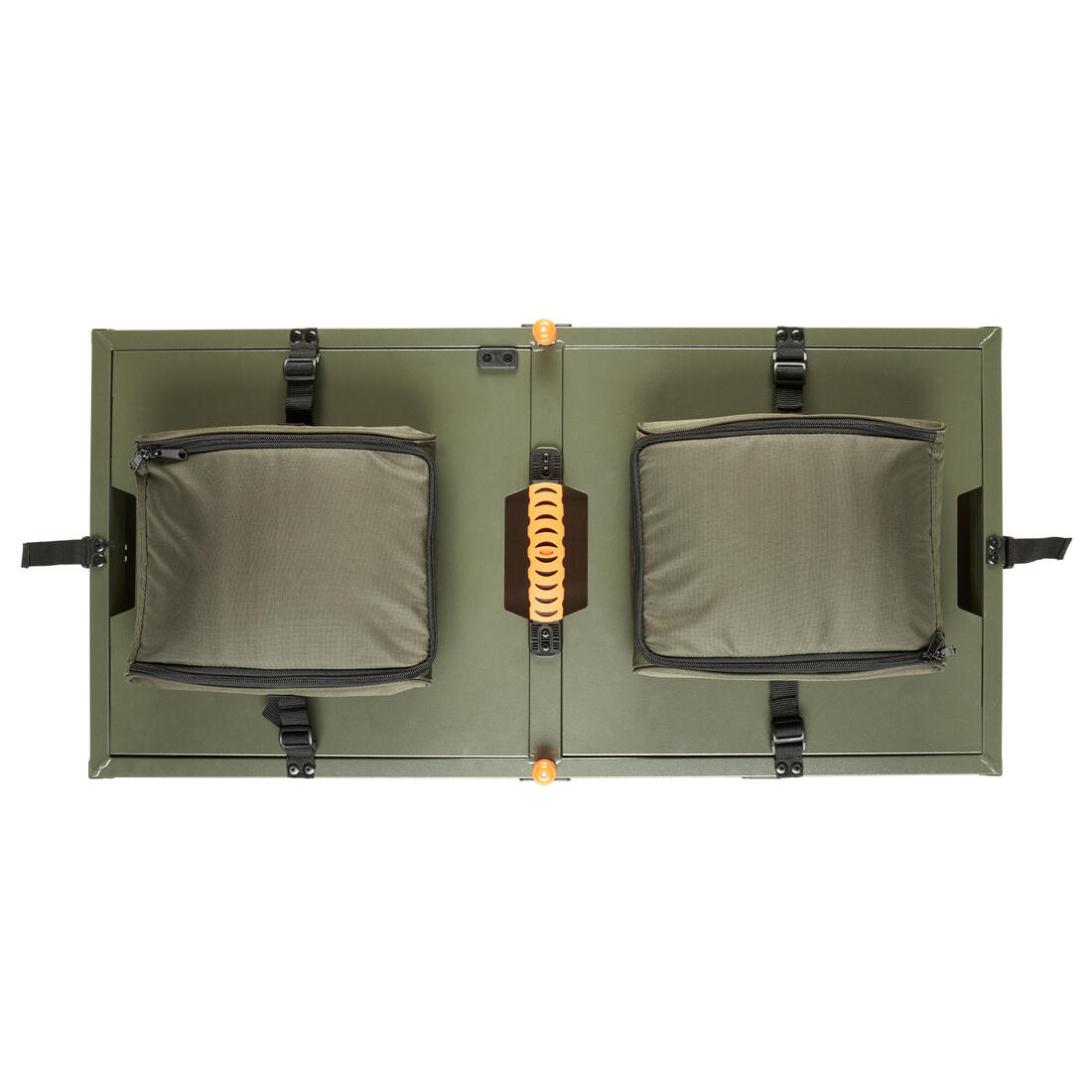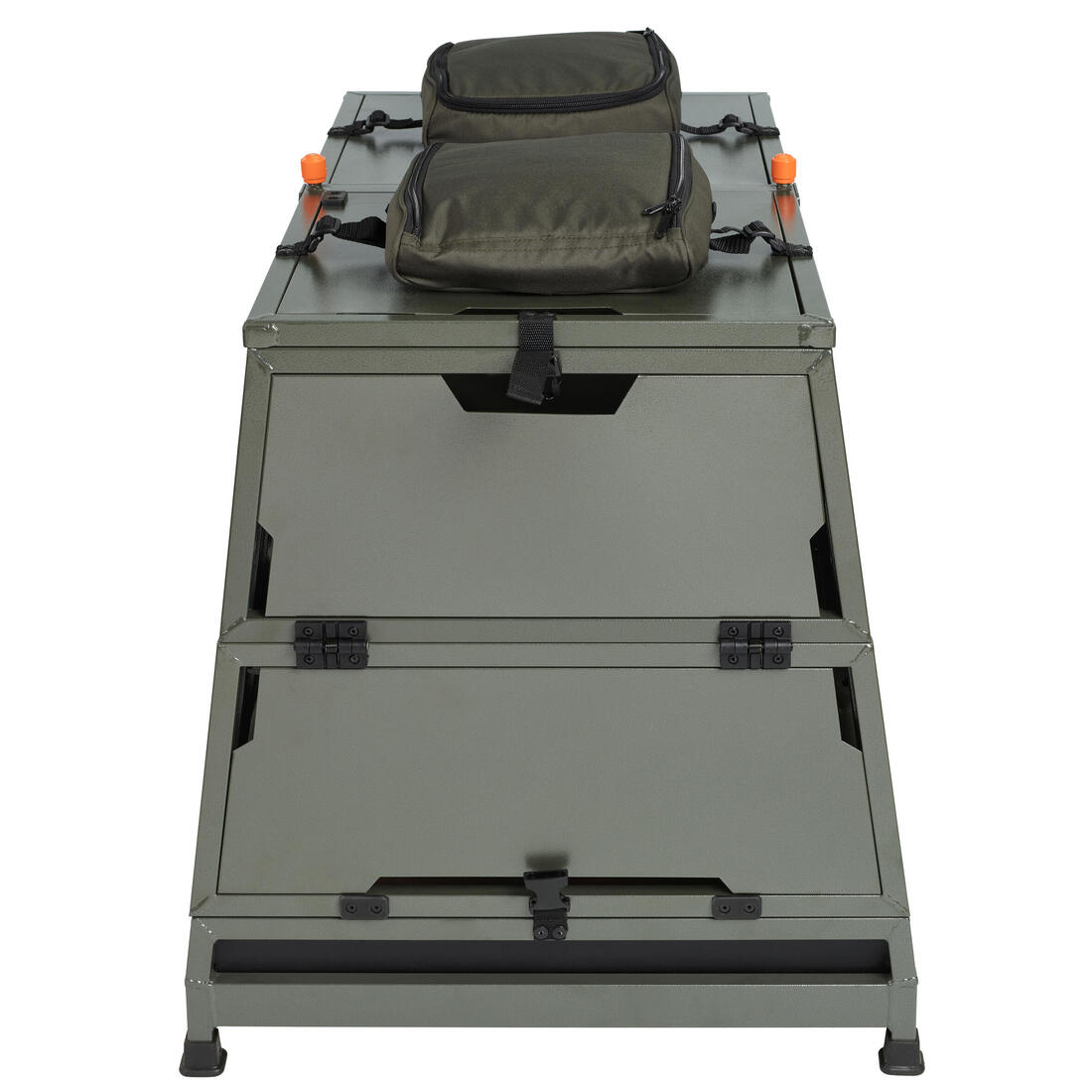La caisse résiste à l'humidité. Sa porte est montée sur vérin. Sur les côtés, des charnières "accordéon" assurent un pliage et dépliage en 15sec. Sangles, pochettes, tapis, cadenas et toile inclus.