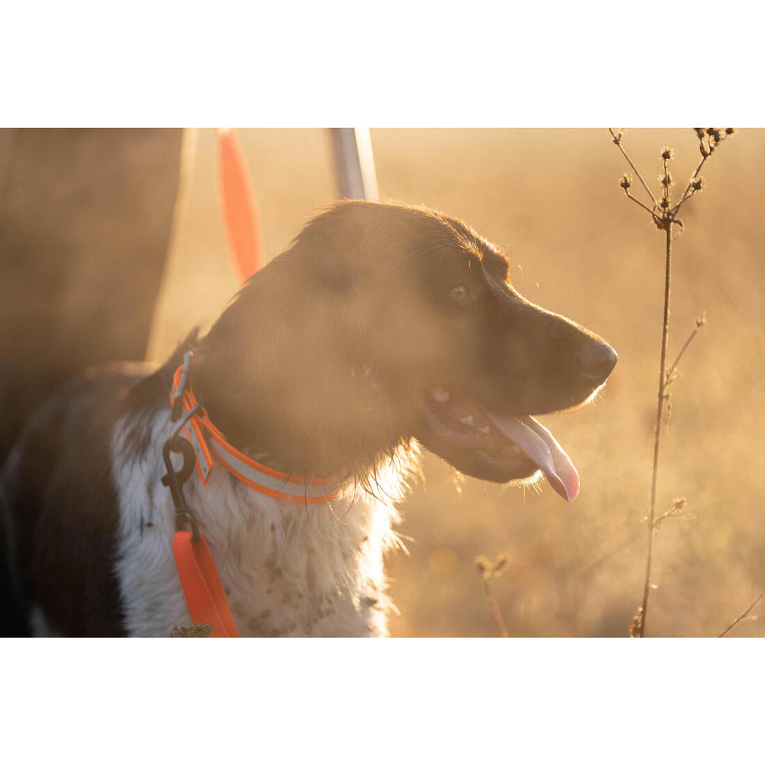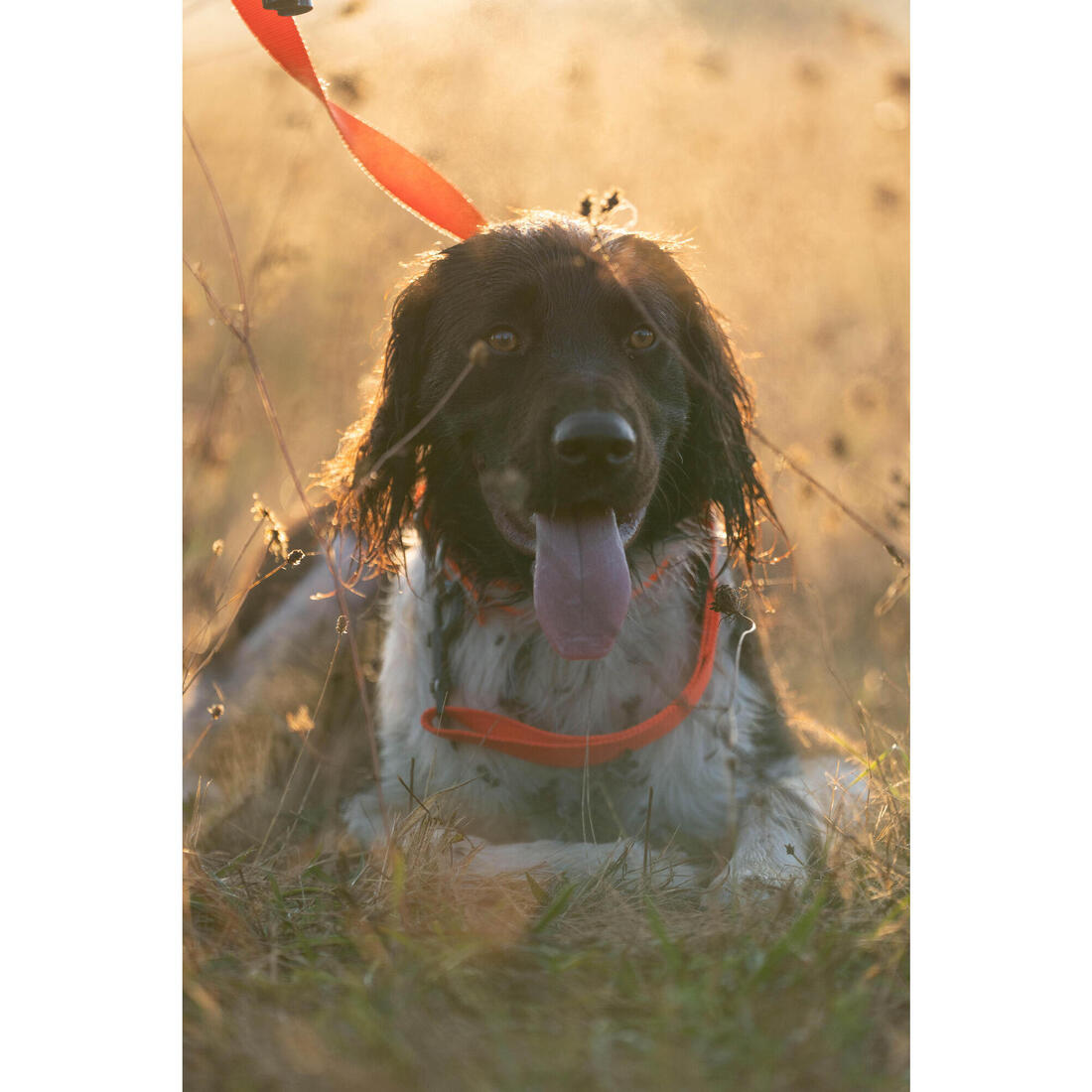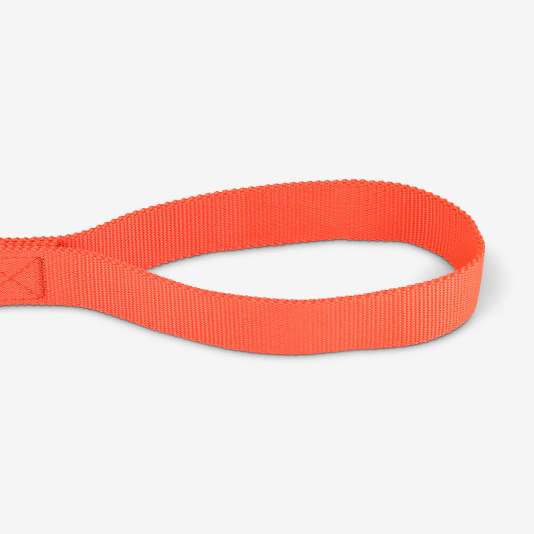 Cette laisse orange est résistante, ajustable et imputrescible.