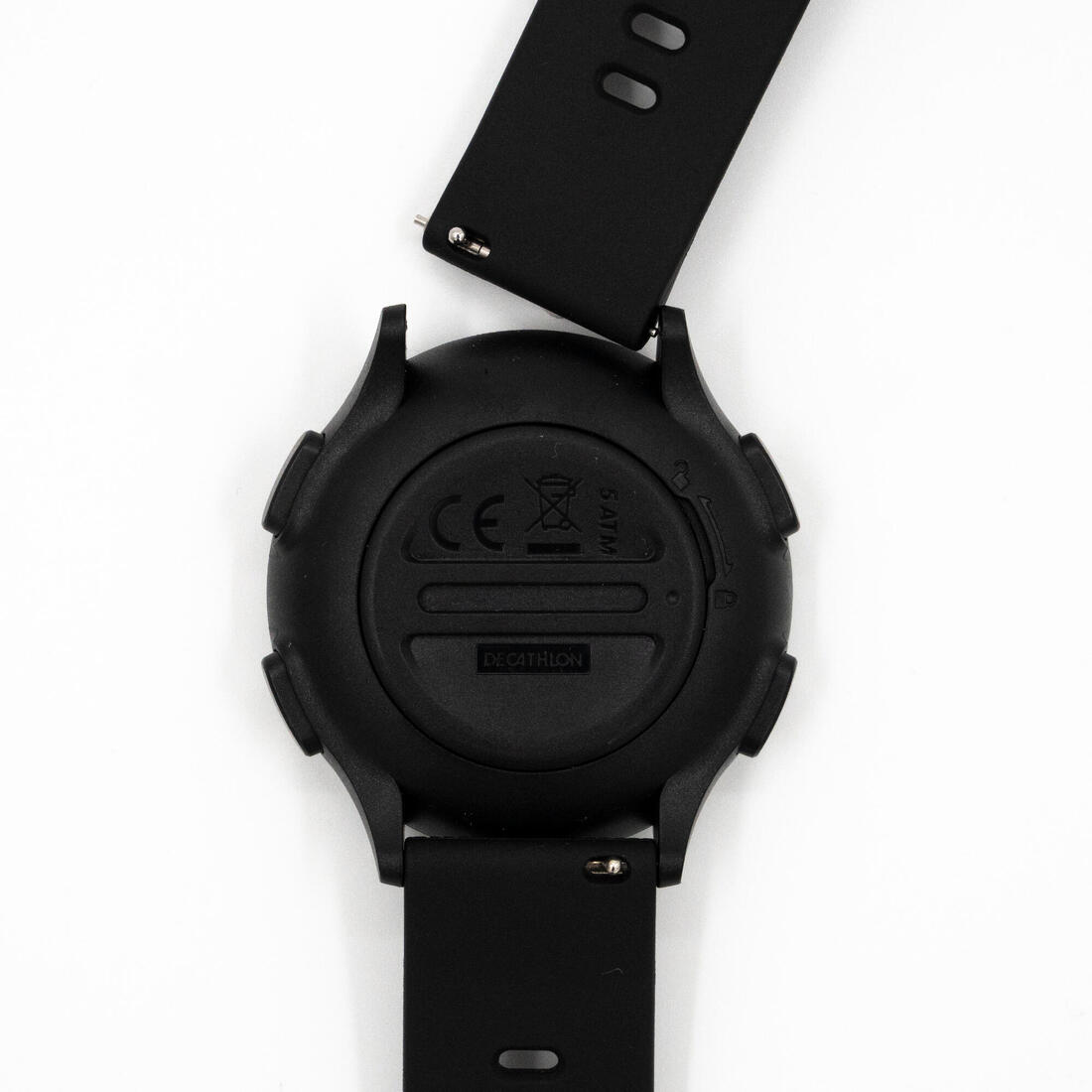 Votre montre vous accompagne lorsque vous nagez en surface ou sous la douche après votre sport grâce à son étanchéité jusqu'à 5 ATM et ses boutons utilisables à la surface de l'eau. ATTENTION : ne pas utiliser les boutons en nageant SOUS l'eau. (Exemple : ne pas utiliser les boutons à 1 mètre de profondeur)