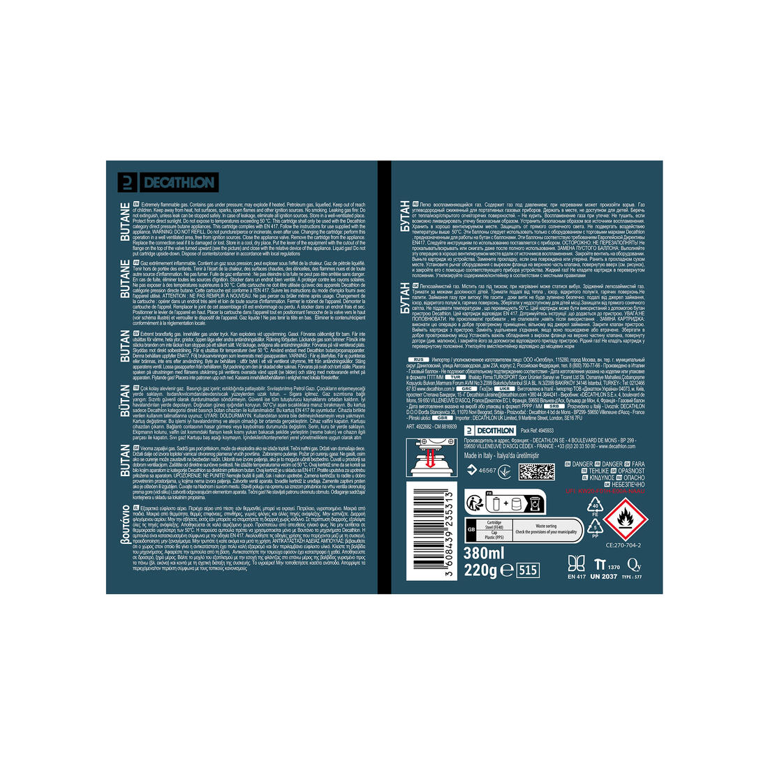 Cette cartouche est conforme à la norme EN 417. Elle doit être utilisée qu'avec des appareils de marque Décathlon Quechua ou autres marques conformes à la norme EN 17476 de catégorie pression directe mélange butane-propane. Lire les indications et précautions d'usages apposées sur la cartouche