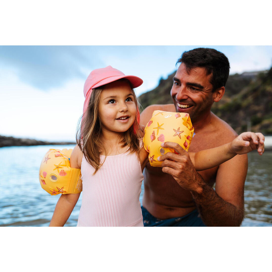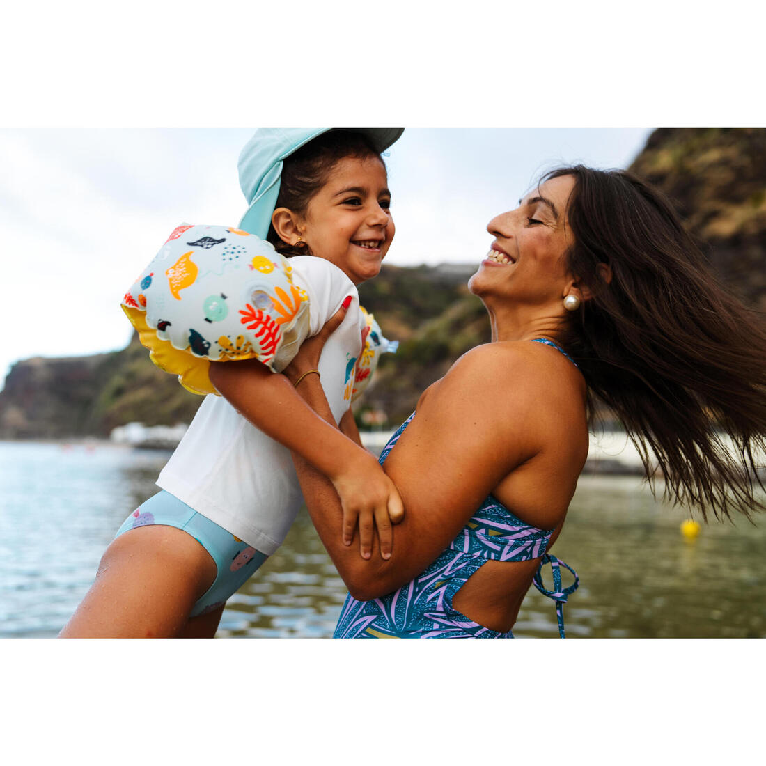 La casquette anti UV protège les bébés, même dans l'eau. Grâce à sa forme couvrante , elle abrite parfaitement la nuque et les oreilles pour qu'ils profitent pleinement des activités aquatiques.