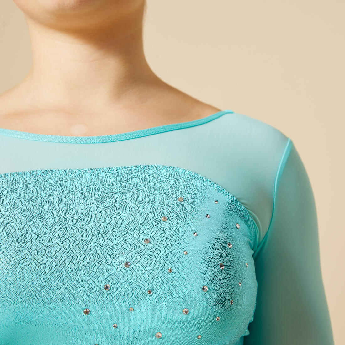Ce justaucorps manches 3/4 sublimé de strass et de voile vous accompagnera lors de vos entraînements et conviendra parfaitement pour vos compétitions !