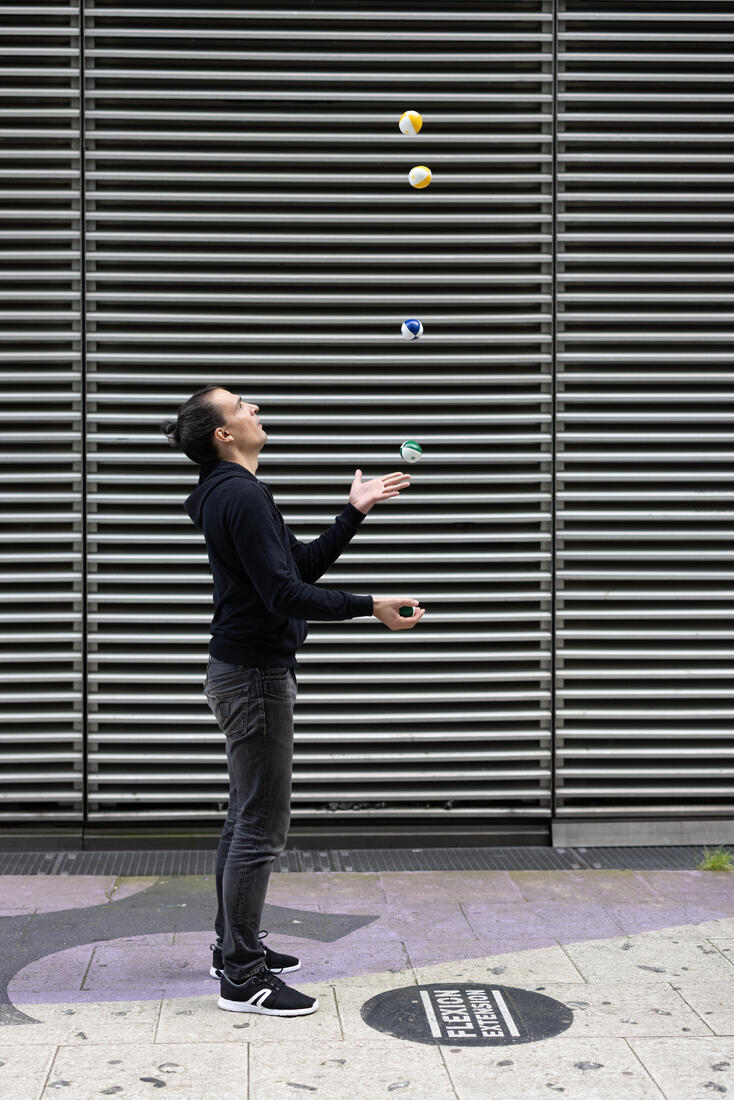 Prenez deux balles dans une main et une balle dans la main opposée. Dans un premier temps, focalisez vous sur la main aux deux balles. Lancez l'une des deux balles et lorsqu'elle arrive à son sommet, lancez la balle tenue dans la main opposée. Vous devrez ensuite récupérer les deux balles dans les deux mains opposées. Quand la deuxième balle arrive à son point le plus haut, envoyez la troisième balle à son tour. Vous savez maintenant jongler avec 3 balles !