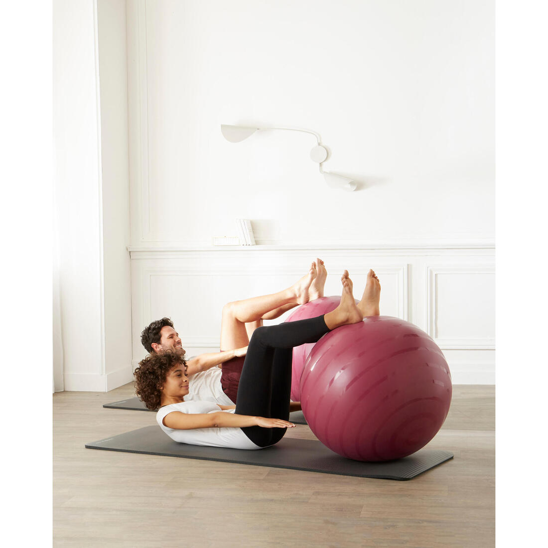 Nous vous conseillons d'utiliser une pompe, vendue séparément (référence 8214626, ou 8490986). Gonflez votre gym ball au maximum de sa taille en vous aidant d'un mètre ruban pour mesurer son diamètre. Pour le ballon taille 1 ne dépassez pas 55cm. Vérifiez le gonflage en vous asseyant sur le ballon : vos genoux doivent se positionner à la même hauteur que vos hanches.