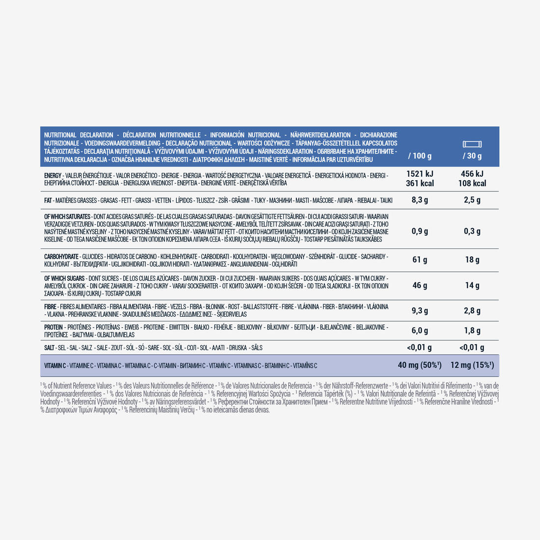 Son ouverture facile, et sa machabilité améliorée par les graines de tournesol et de lin, font de cette barre le ravitaillement idéal pour vos efforts de plus de 3 h. Par ailleurs, la datte étant un fruit naturellement riche en glucides, et se digérant bien, ce dernier est parfaitement adapté à l'alimentation sportive d'endurance.