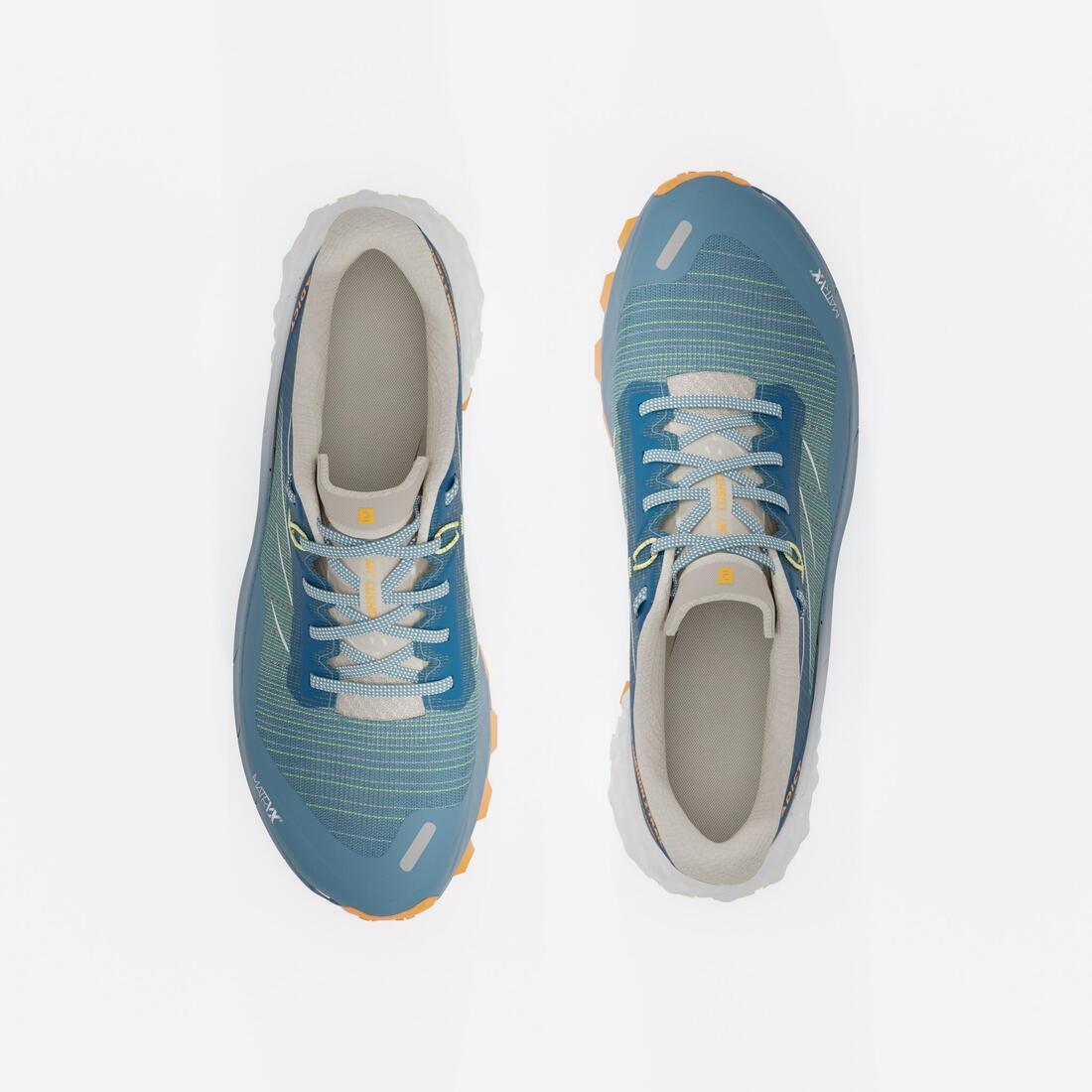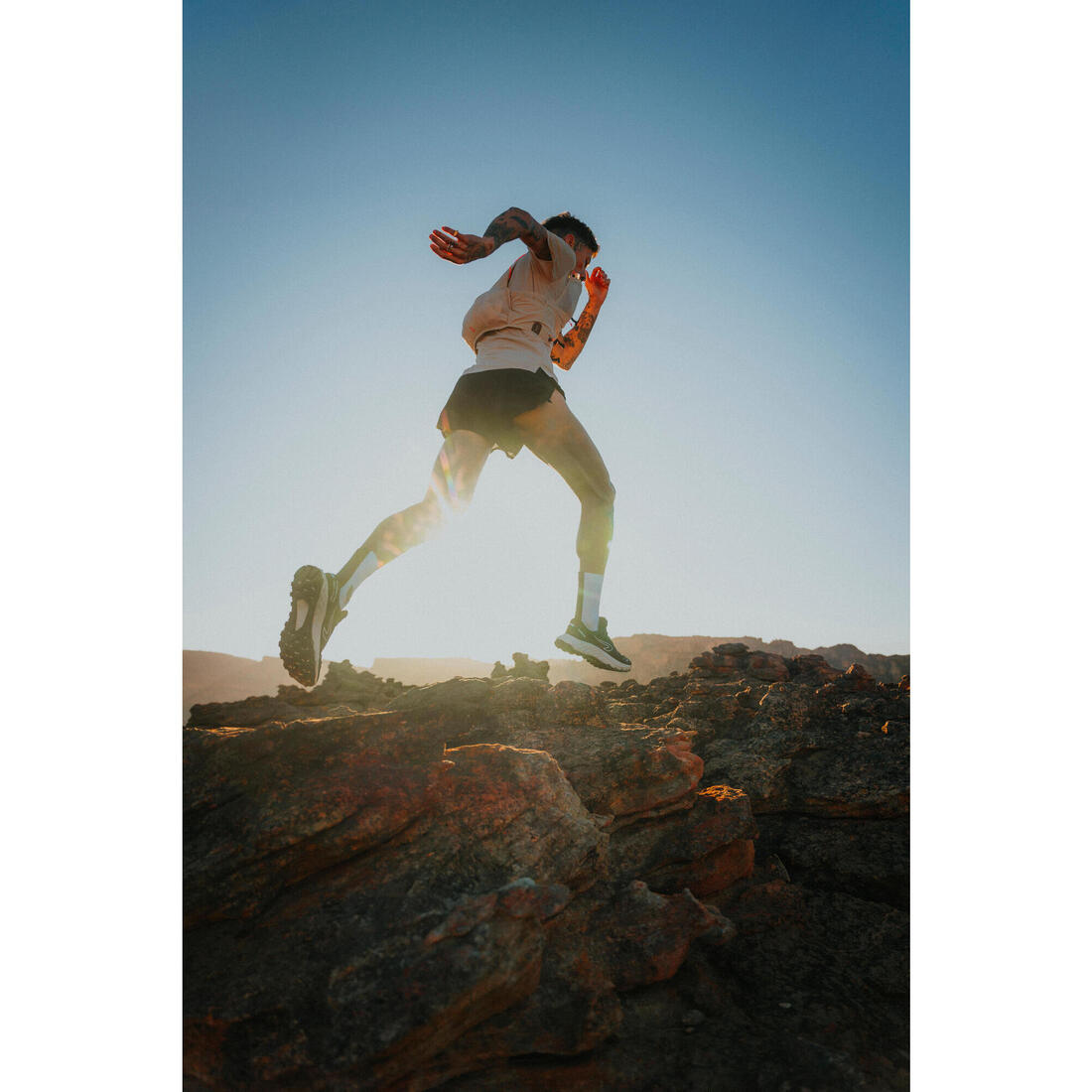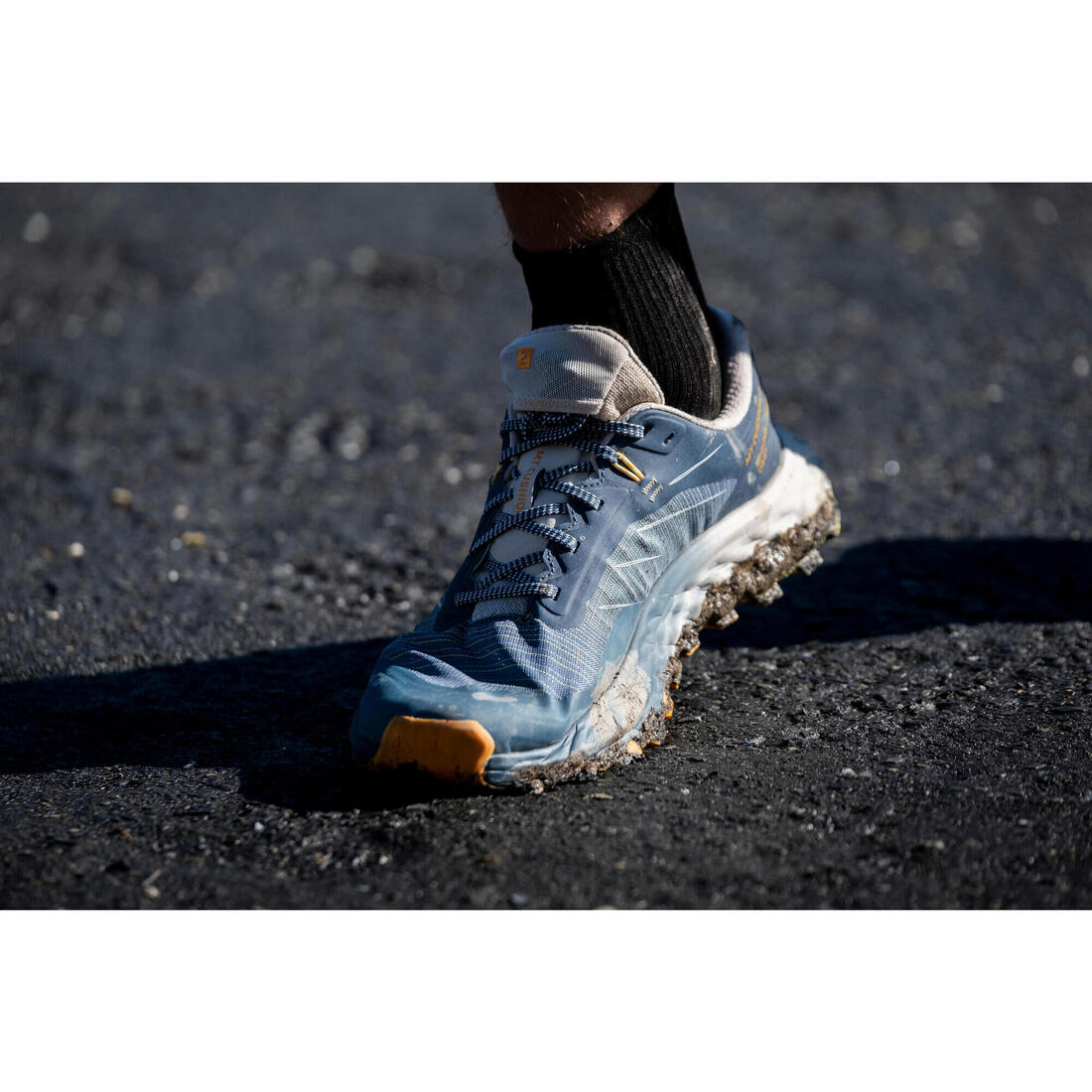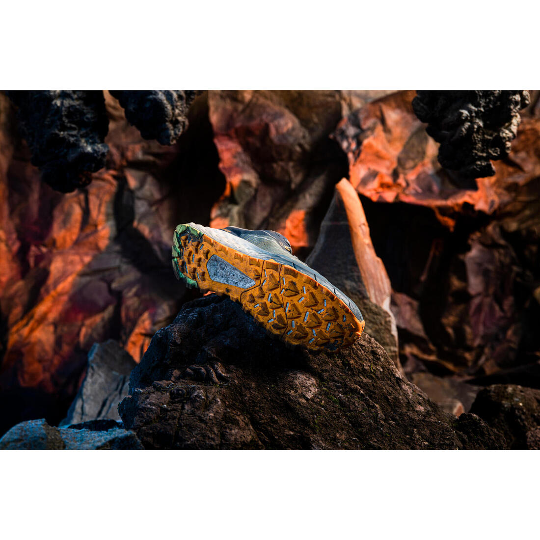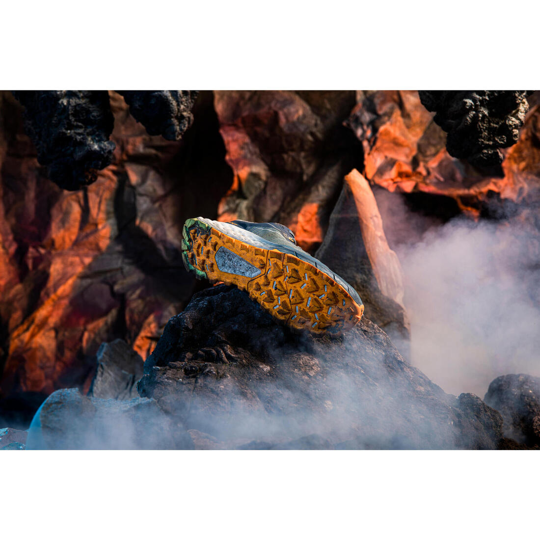 Nous avons opté pour des crampons de 5mm sous toute la semelle : l'accroche est optimale et la chaussure n'est ni alourdie, ni rigidifiée par leur poids. De plus, nous avons suffisamment espacés nos crampons, pour faciliter le retrait de la terre qui pourrait se glisser entre eux. Le caoutchouc de la semelle a judicieusement été sélectionné pour permettre une bonne adhérence sur les pierres ou roches humides. De quoi courir en toute sécurité.