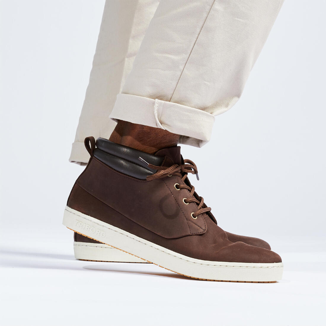 Ces chaussures en cuir nubuck huilé sont imperméables. La semelle est en caoutchouc et permet une très bonne adhérence sur sols et ponts de bateaux mouillés. Elles vous accompagneront au quotidien !