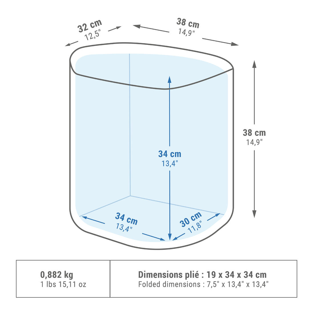 Dépliée, la glacière mesure : Hauteur: 38 cm | Longueur : 38 cm | Largeur : 32 cm Dimensions intérieures: Hauteur : 34 cm | Longueur : 34 cm | Largeur :30 cm Pliée, la glacière gagne en compacité et mesure: Hauteur : 19 cm | Longueur : 34 cm | Largeur : 34 cm