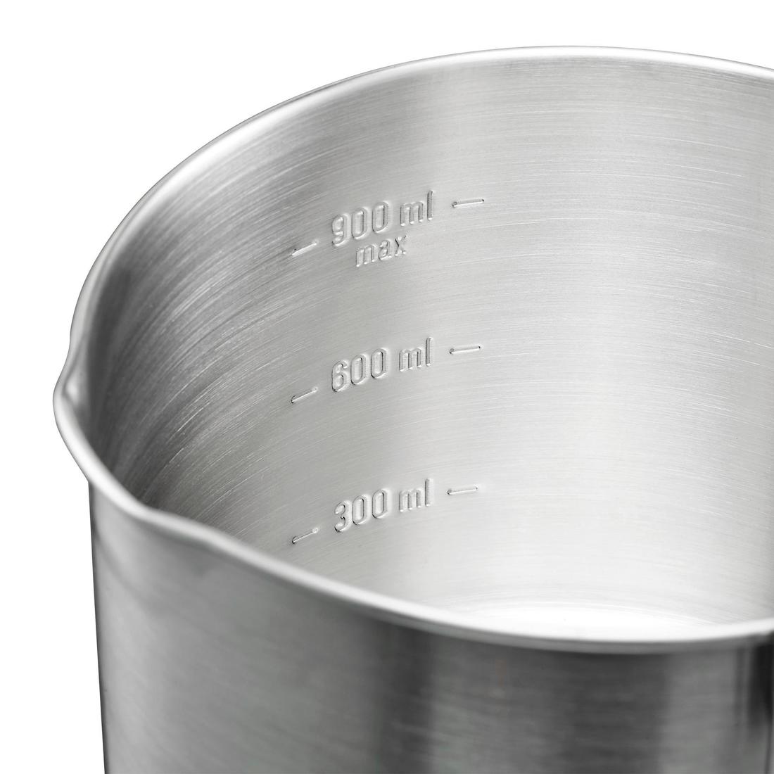 1 casserole graduée avec 1 poignée repliable brevetée. (950 ml utiles, 197 g, Ø 12,5 x 10 cm) 1 bol avec structure pour limiter la diffusion de chaleur (0,45 L utile, 13 x 6,5 cm, 46 g) 1 couvert pliant cuillère / fourchette (11 g, longueur 18,5 cm) 1 couvercle / passoire (35 g) 1 housse de transport (16 g)