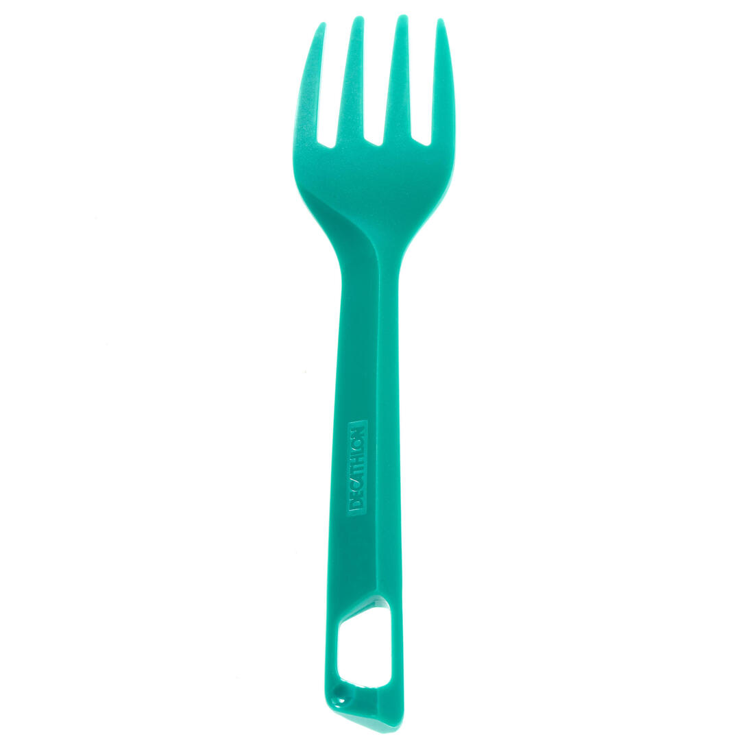 Les 3 couverts peuvent se clipser ensemble en empilant la cuillère, la fourchette et le couteau et en pressant sur le bout du manche à l'endroit du trou. Vous pouvez utilisez l'attache couvert pour faciliter leur transport. Ces couverts en matière plastique (polyamide) sont particulièrement indiqué lors d'une utilisation avec des popotes à revêtement anti-adhésif car ils ne les endommagent pas.
