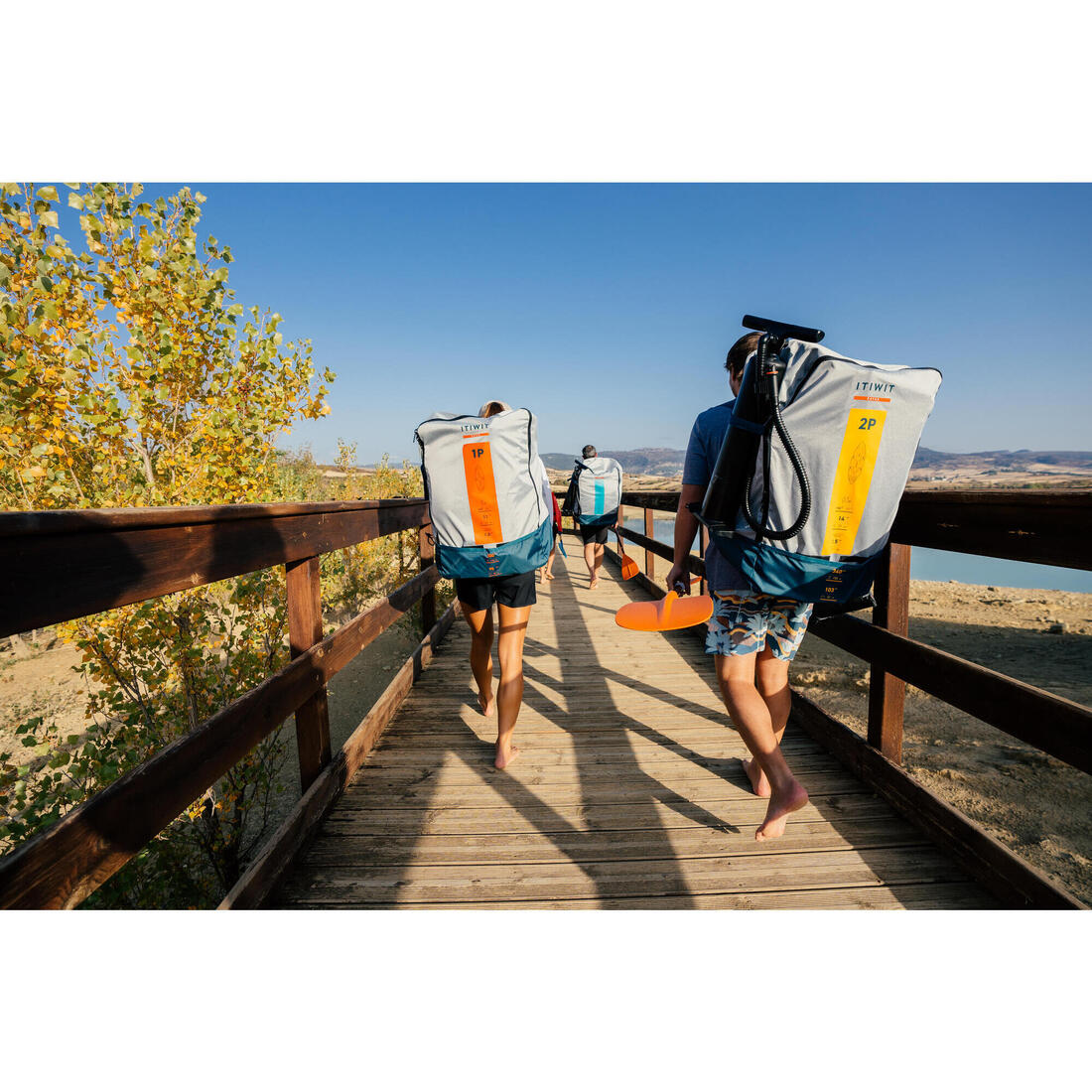 TAILLE GONFLE Longueur : 382 cm Largeur : 108 cm TAILLE PLIE DANS LE SAC Hauteu r: 73 cm Largeur : 44 cm Epaisseur : 33 cm Poids : 17 kg Pression maximale : 0,1 bar (1,5 PSI) Nombre de places : 2 ou 3 places Contenu : kayak, sac, kit réparation, dérives NE CONTIENT PAS DE POMPE NE CONTIENT PAS DE PAGAIE Fonctionne avec une pompe à main double action multi embouts Itiwit