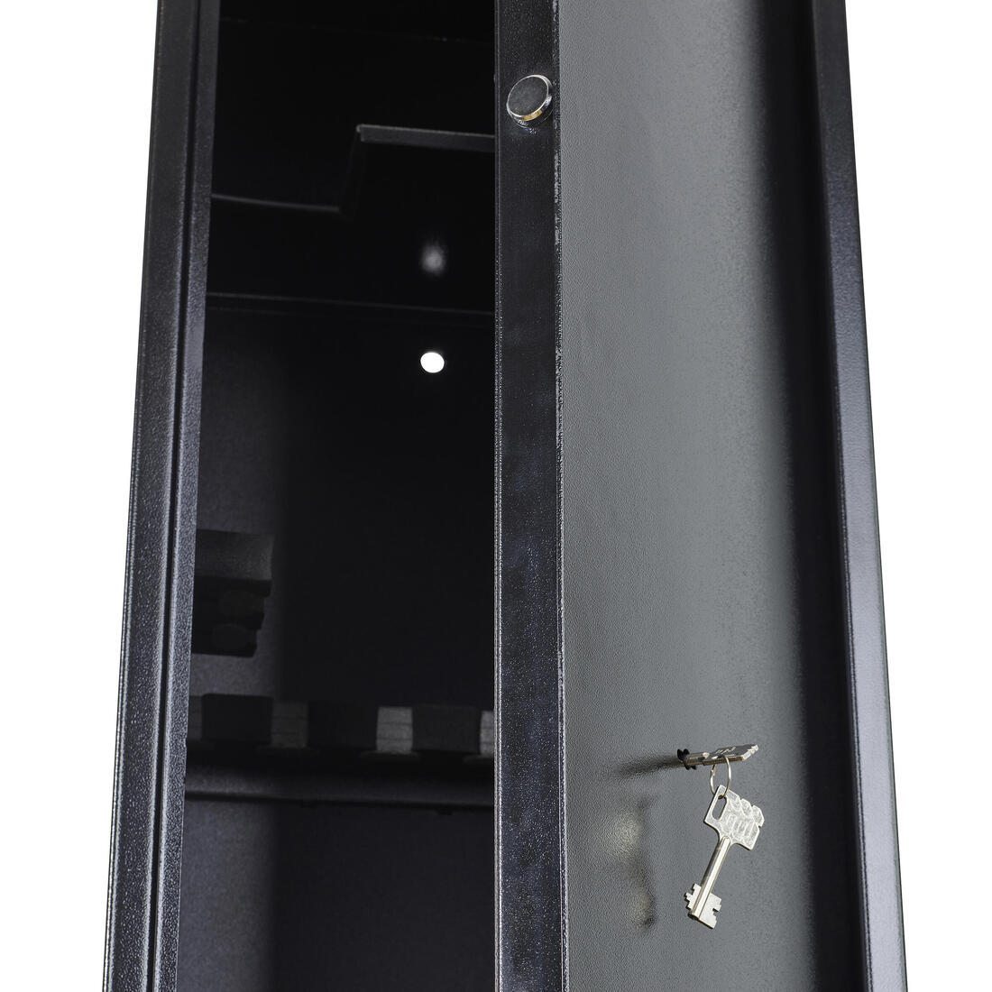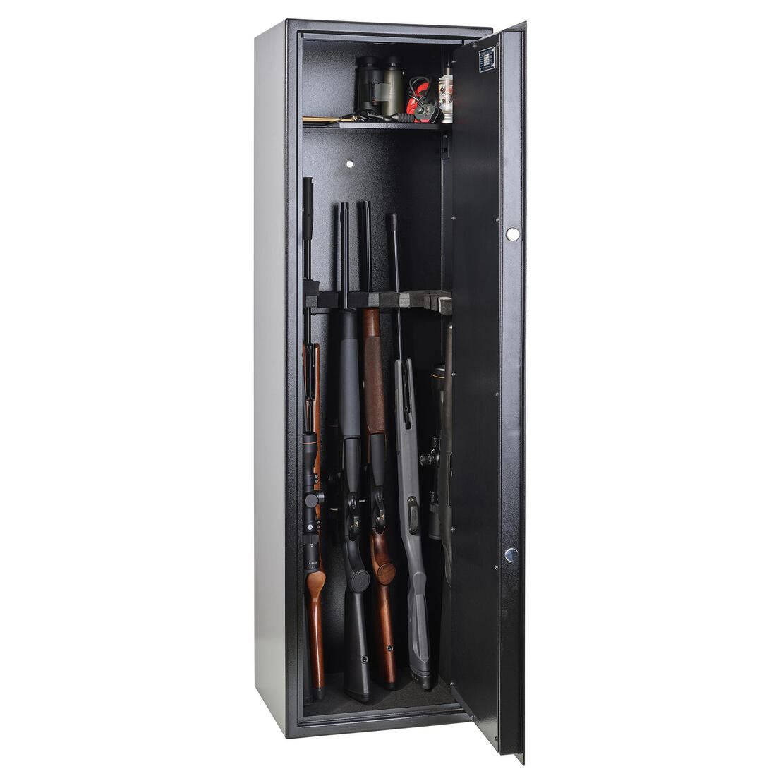 Dimensions extérieures : - Hauteur 145cm x Largeur 43cm x Profondeur 35cm Dimensions intérieures : - Hauteur 144cm x Largeur 42cm x Profondeur 28,5cm. Poids : 79 kg. Contenance maxi : jusqu'à 10 armes maximum de 144 cm grâce à la tablette réglable.