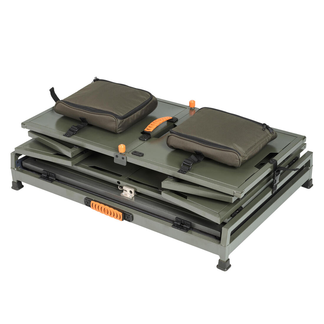 La caisse résiste à l'humidité. Sa porte est montée sur vérin. Sur les côtés, des charnières "accordéon" assurent un pliage et dépliage en 15sec. Sangles, pochettes, tapis, cadenas et toile inclus.