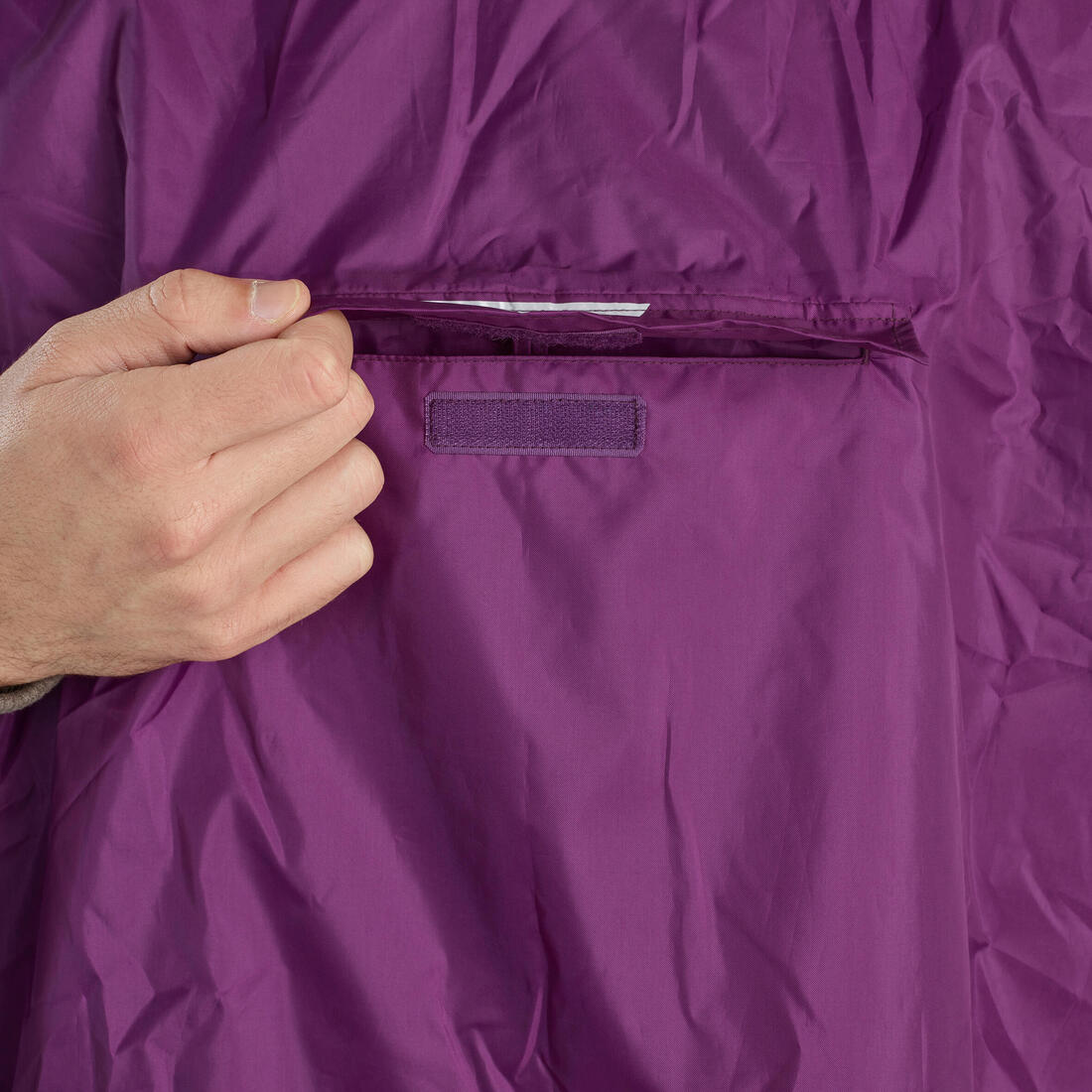 Grâce à sa couple ample, ce poncho vous permet de le porter par dessus votre veste ou votre pull, ainsi que par dessus un petit sac à dos de 20 litres notamment. Sa surface vous couvre de la tête aux cuisses, et les cordons de serrage vous permettent de l'ajuster à votre tête. Lorsque la pluie cesse, vous n'avez qu'à ranger ce poncho dans la poche centrale de ce dernier. Voici les dimensions de cette poche : 23,5 cm X 20 CM