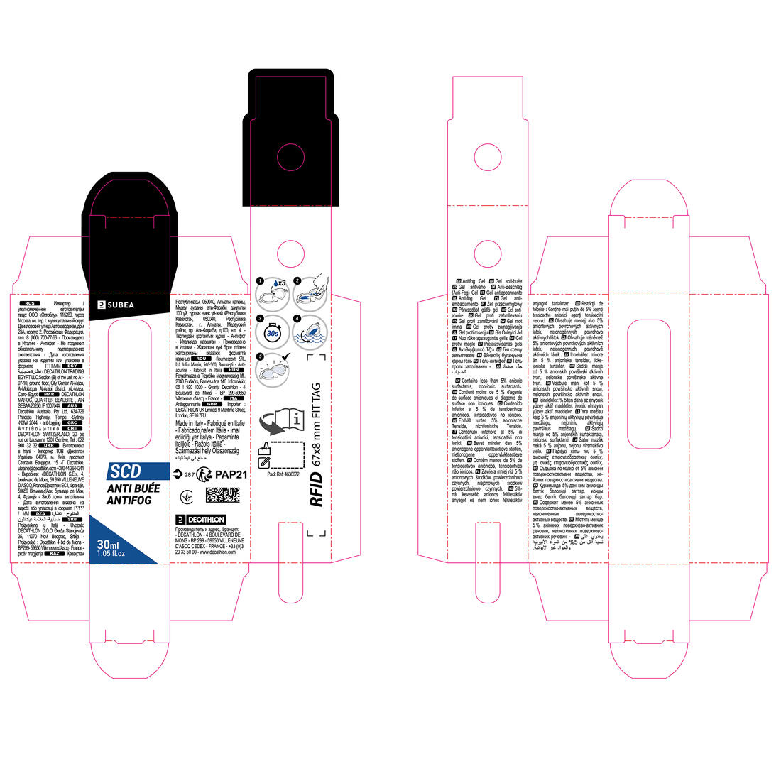 1. Appliquez 1/2 gouttes de Gel sur la vitre intérieure du masque et bien étaler le produit sur toute sa surface 2. Laisser agir le Gel environ 1 minute; 3. Rincez la vitre dans l’eau avant de porter le masque en prenant soin de ne pas la toucher avec vos doigts.