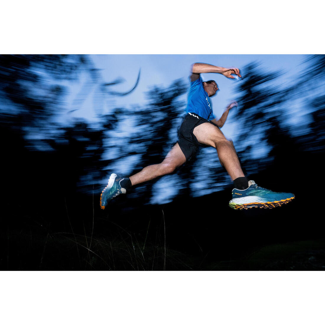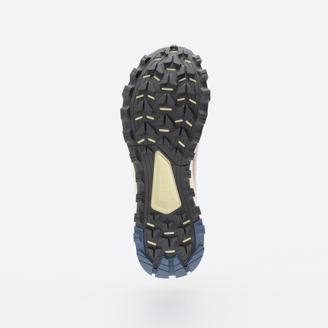 Nous avons opté pour des crampons de 5mm sous toute la semelle : l'accroche est optimale et la chaussure n'est ni alourdie, ni rigidifiée par leur poids. De plus, nous avons suffisamment espacés nos crampons, pour faciliter le retrait de la terre qui pourrait se glisser entre eux. Le caoutchouc de la semelle a judicieusement été sélectionné pour permettre une bonne adhérence sur les pierres ou roches humides. De quoi courir en toute sécurité.