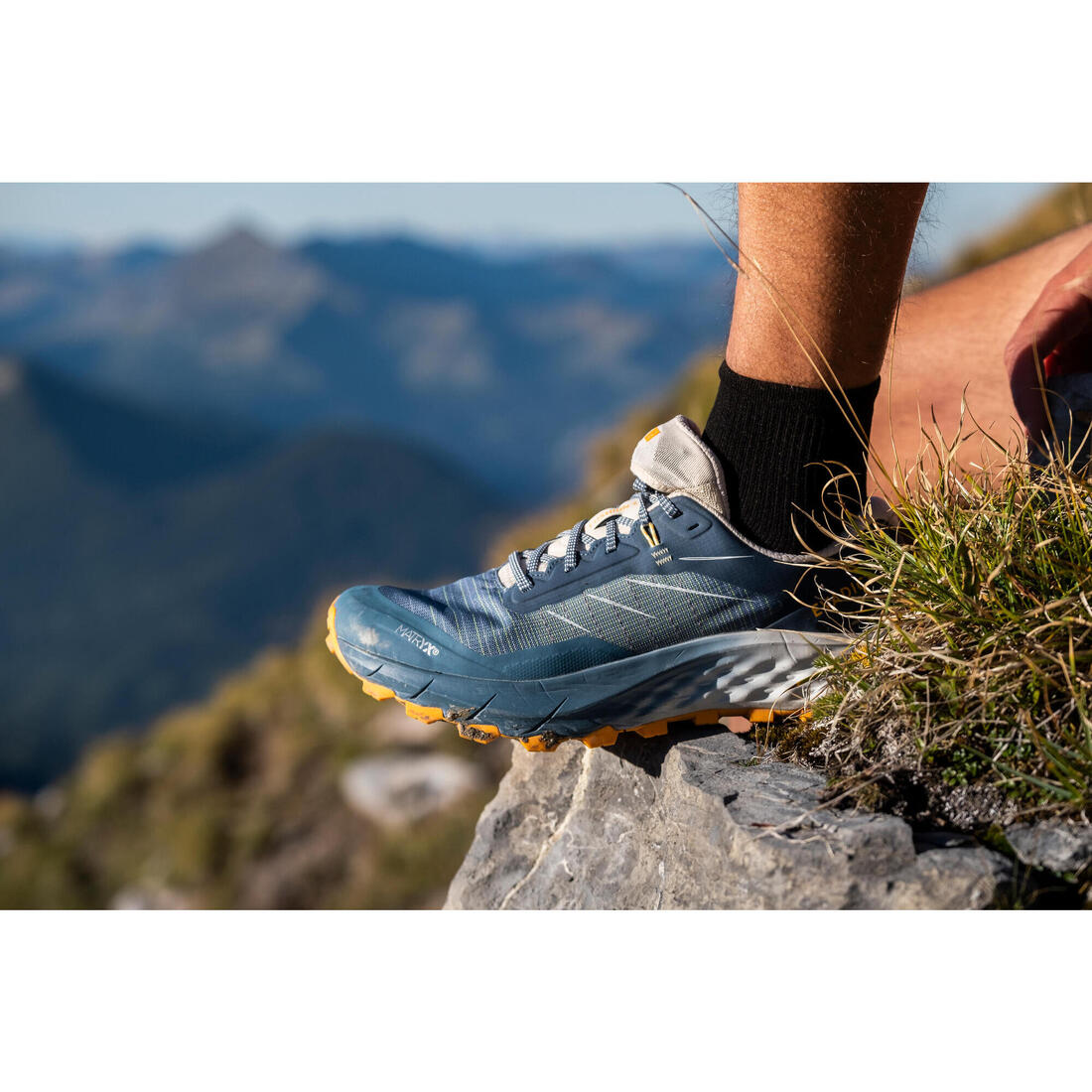 MT, deux lettres pour parler de la montagne, la bien-aimée du traileur. Des chaussures pour la montagne, donc, mais pas que : elles conviennent à tous les terrains, du rocher à la boue, en passant par les sentiers secs. “Il faut s'imaginer courir sur un coussin léger, doux et moelleux. La MT CUSHION 2 est une chaussure qui protège et maintient”, raconte Thierry, chef de produit. CUSHION signifie amorti/coussin, pour une pratique agréable et confortable, synonyme de plaisir et de performance !