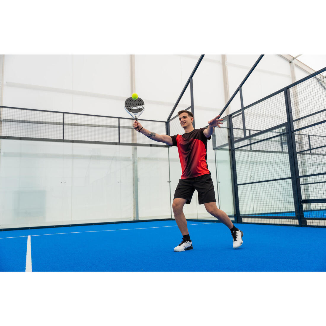 Le padel se joue sur du gazon synthétique avec du sable. Cela rend extrèmement glissants les déplacements. Les chaussures de padel sont dotées d'une semelle avec une géométrie spécifique qui vous apportera l'accroche nécessaire pour les joueurs de tous niveaux. Elles vous apporteront aussi de la stabilité latérale, du maintien du pied et de l'amorti pour absorber les chocs.