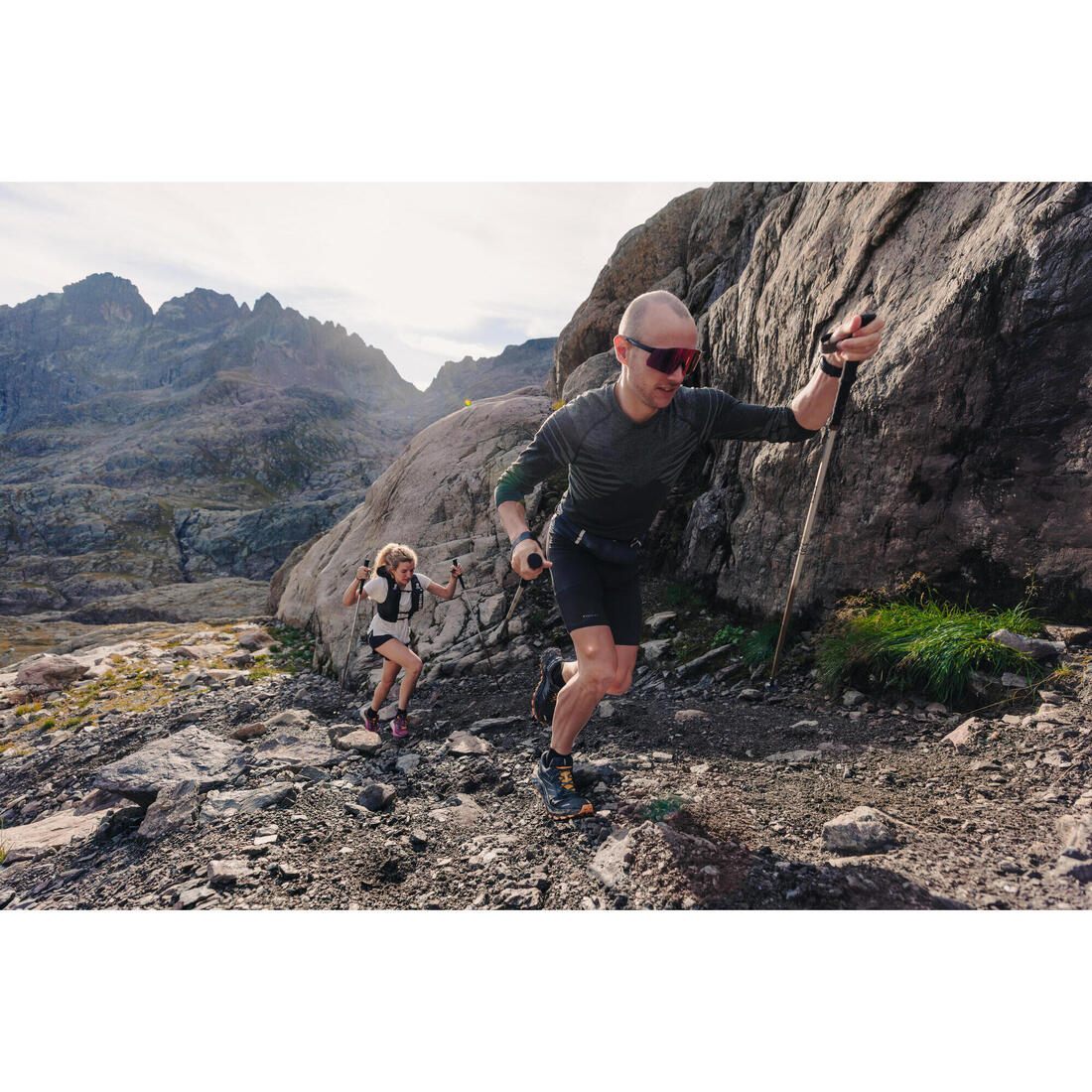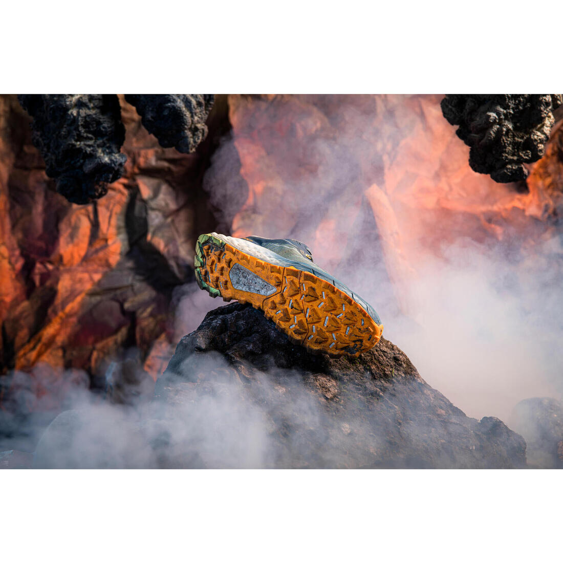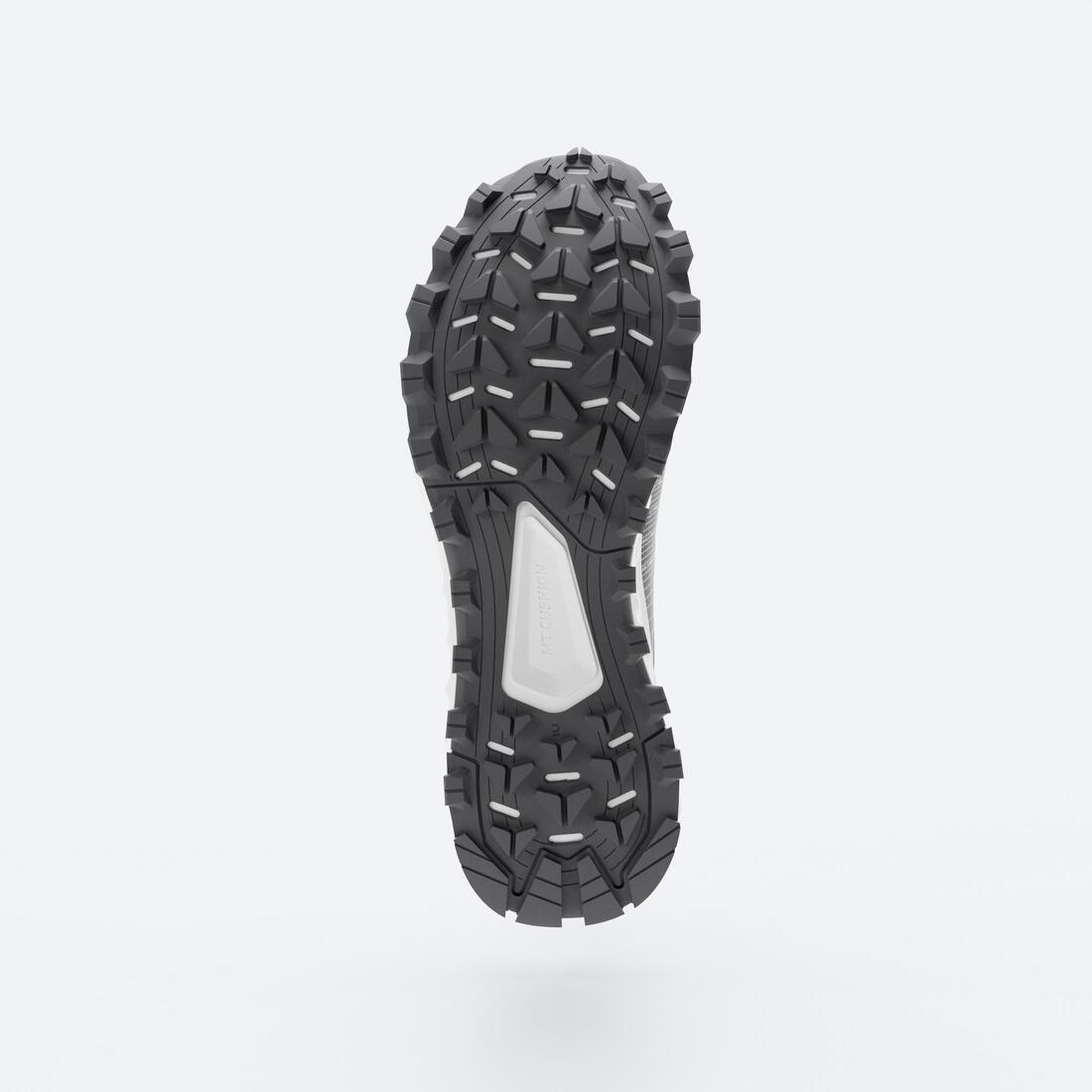 Nous avons opté pour des crampons de 5mm sous toute la semelle : l'accroche est optimale et la chaussure n'est ni alourdie, ni rigidifiée par leur poids. De plus, nous avons suffisamment espacés nos crampons, pour faciliter le retrait de la terre qui pourrait se glisser entre eux. Le caoutchouc de la semelle a judicieusement été sélectionné pour permettre une bonne adhérence sur les pierres ou roches humides. De quoi courir en toute sécurité.