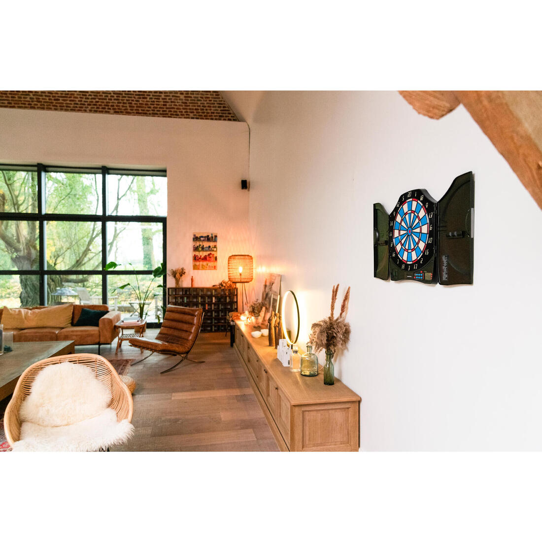 Vous cherchez une cible électronique qui s'intègre dans votre intérieur ? La cible ED 310 vous permet de ranger facilement vos fléchettes après la partie, grâce à ses portes de rangement.