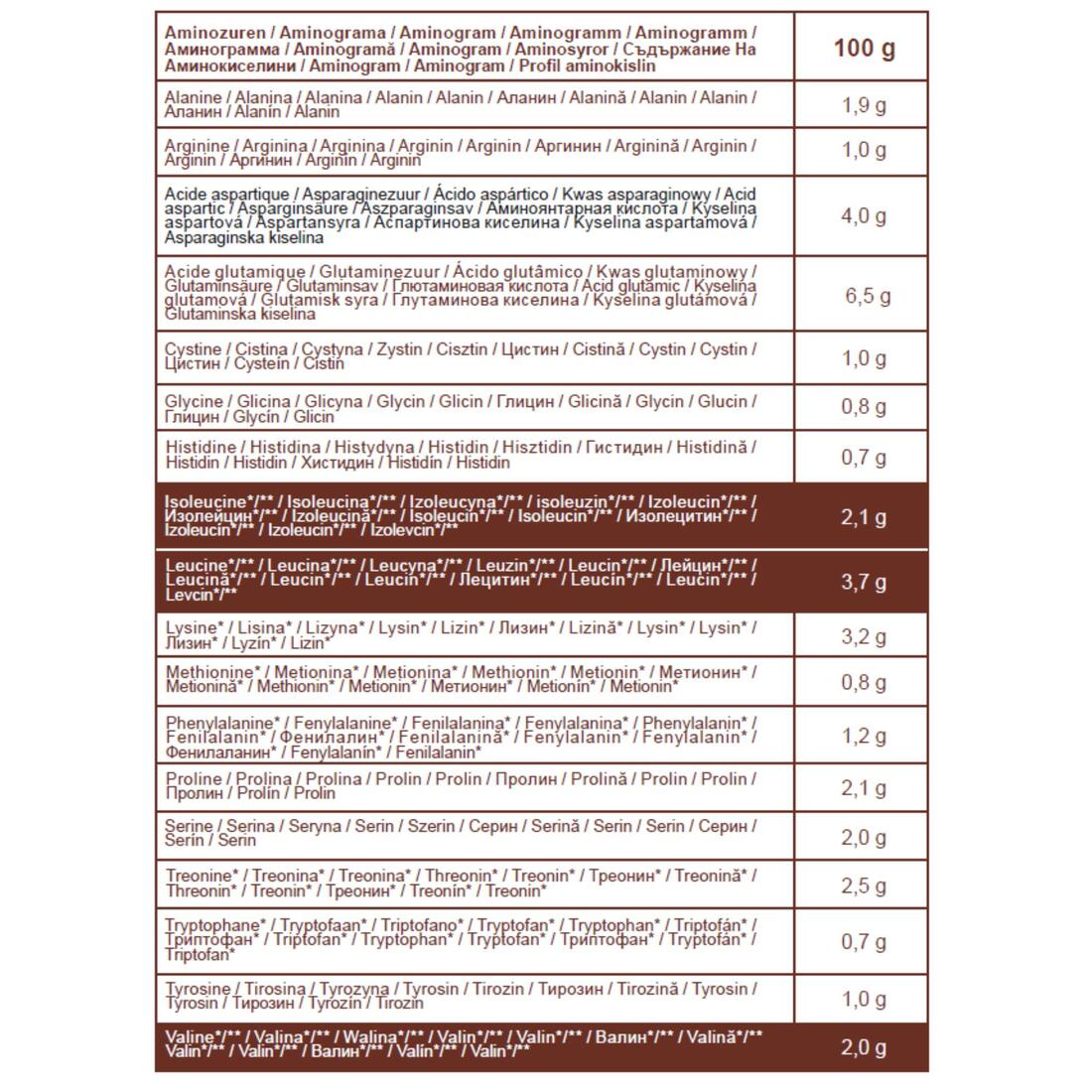 Tableau nutritionnel : 100 g Energie: 375 kcal / 1587 kJ Matières grasses: 4,6 g dont acides gras saturés: 2,0 g Glucides: 45 g dont sucres: 8,6 g Protéines: 36 g Sel: 0,30 g