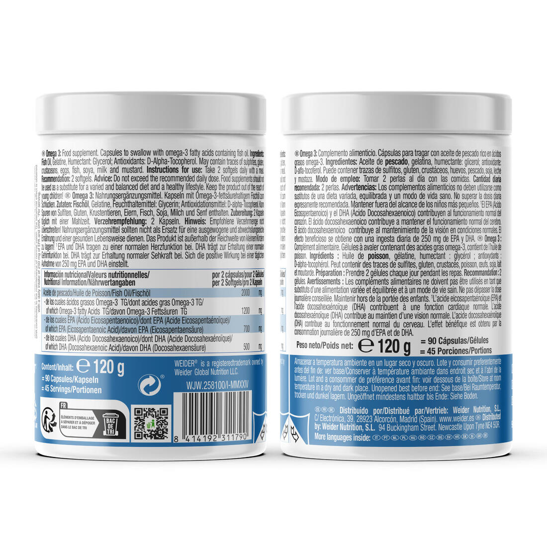 pour 2 gelules Vitamine E 10mg Huile de Poisson 2000mg - dont acides gras Omega-3 1260mg - dont EPA (Acide Eicosapentaénoïque) 700 mg - dont DHA (Acide Docosahexaénoïque) 500 mg