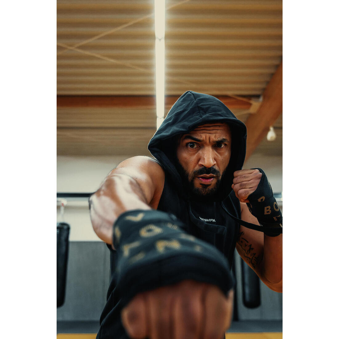 Le débardeur capuche conçu pour l'échauffement du boxeur. Coupe ample au niveau des bras favorisant la liberté de mouvement. Capuche intégrée afin de rester au chaud pendant les temps morts.