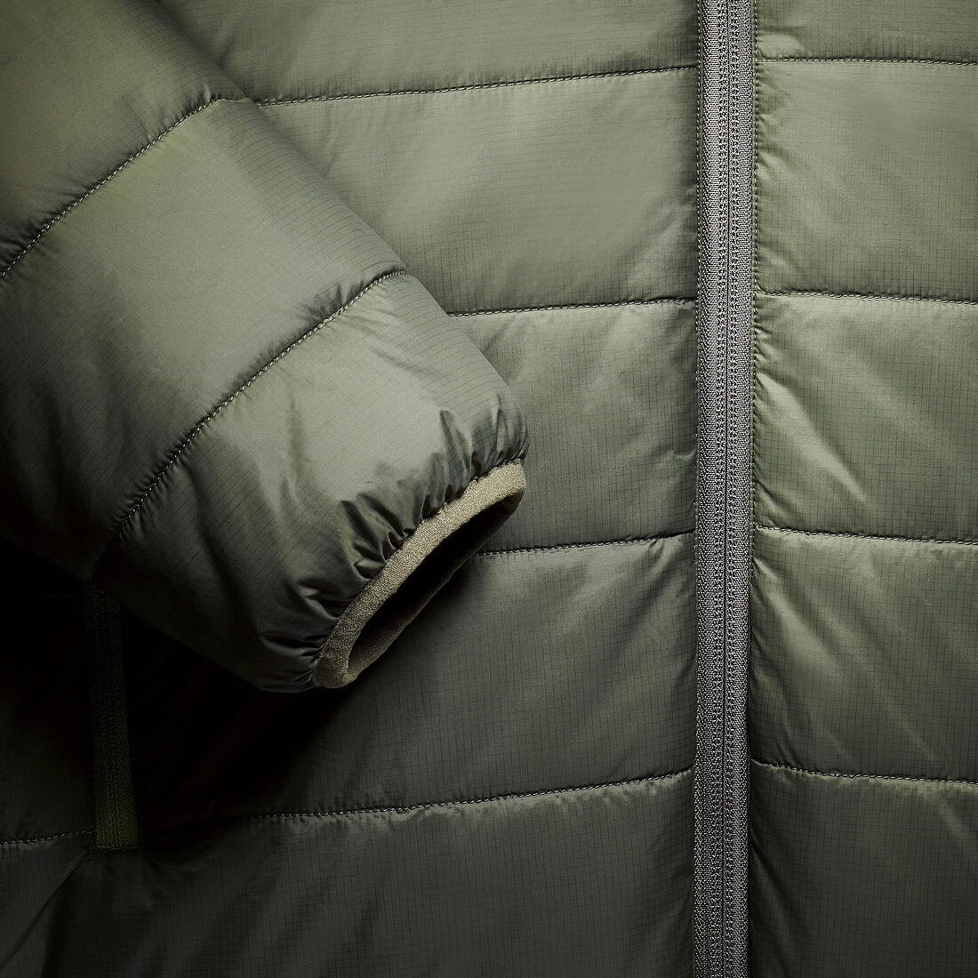 Nous utilisons une ouate de 125 g/m² sur le corps et de 100 g/m² sur les manches et la capuche. La ouate est composée de fibres hélicoïdales siliconées qui lui apportent une grande compressibilité et une forte résilience. Malgré sa finesse, elle possède un haut niveau d'isolation grâce à l'air emprisonné à l'intérieur, tout en conservant un faible poids. Elle présente l'avantage de conserver sa chaleur même mouillée.