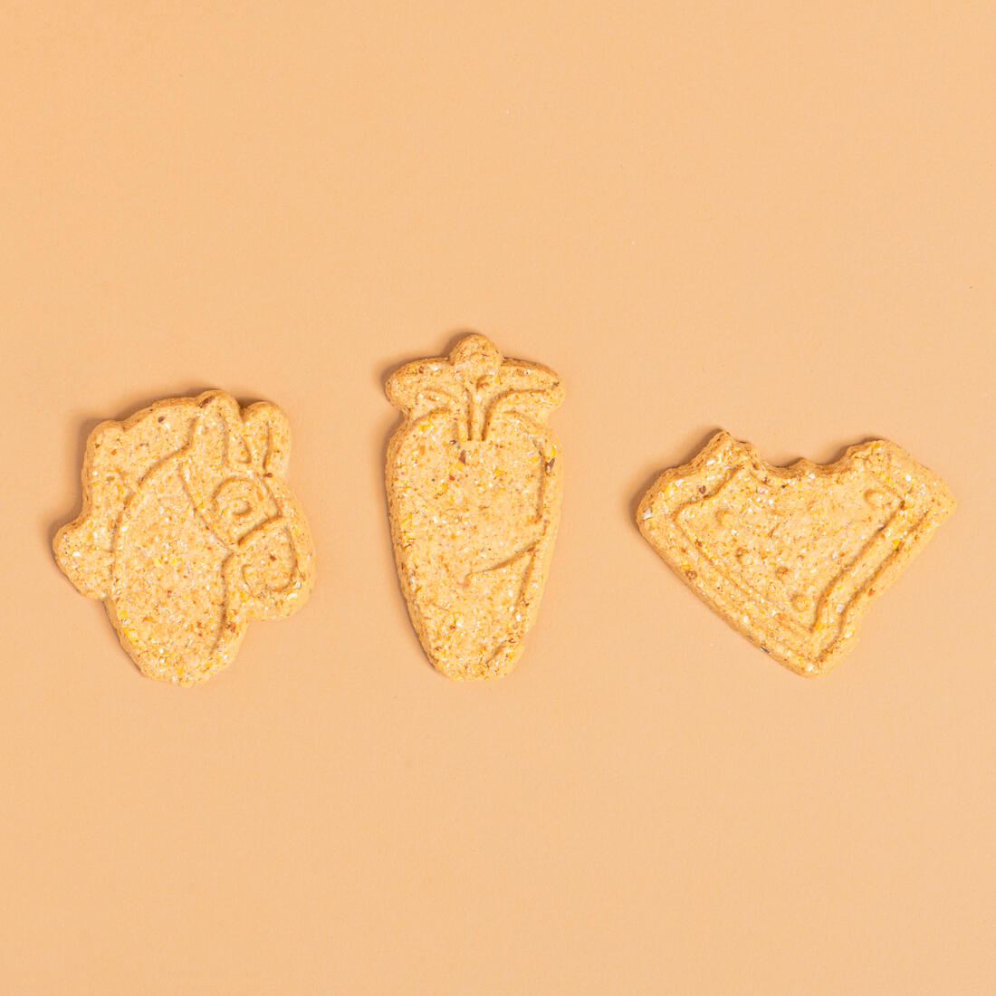 Composition : Farine de blé, maïs broyé, sucre, flocons de carotte broyés (3%), poudre de paprika, poudre de carotte (1%), sirop de sucre, huile de colza, sel. Constituants analytiques : Protéines brutes : 9.2% Cellulose brute : 1.9% Matières grasses brutes : 1.4% Matières minérales brutes : 1.1% Sodium : 0.1%
