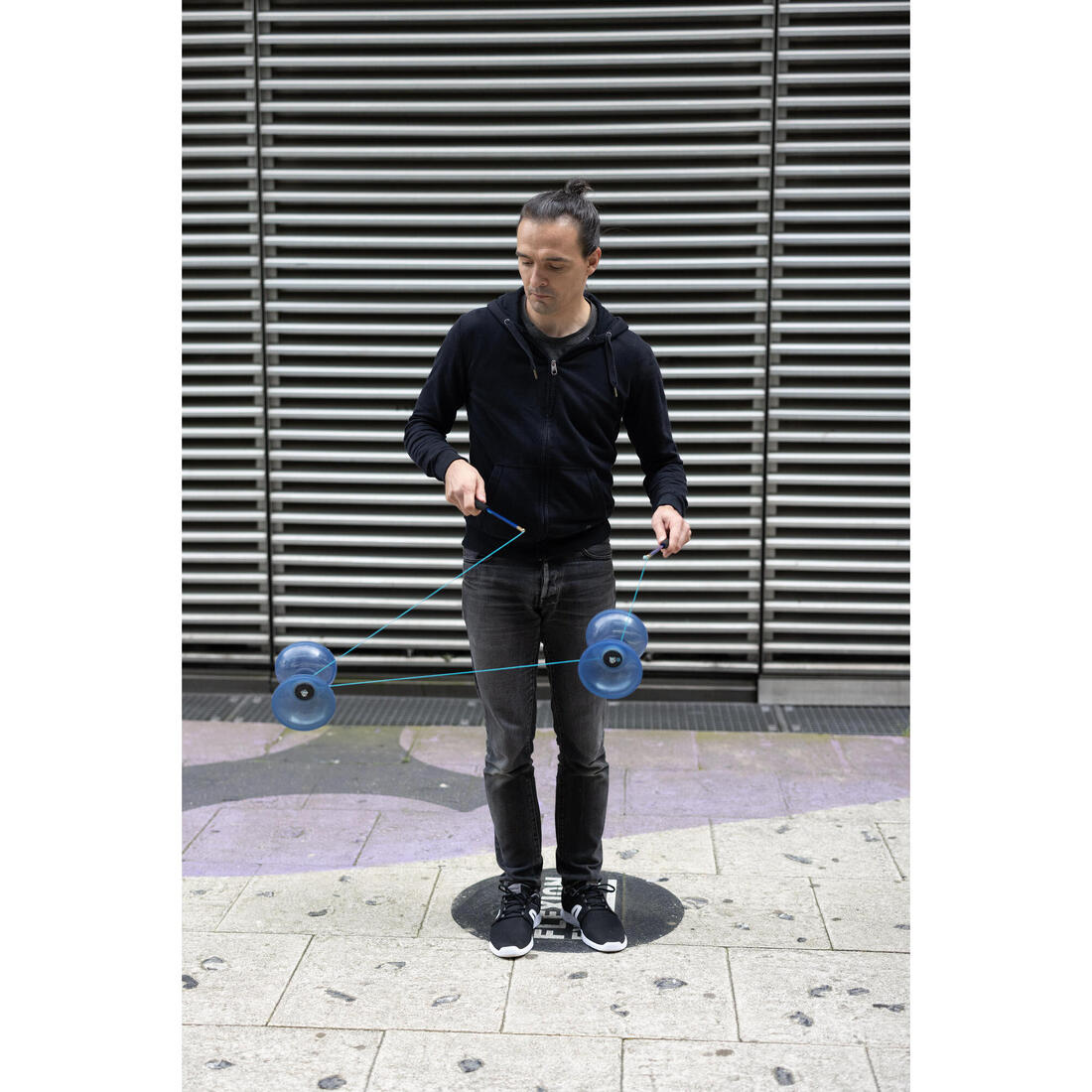 La ficelle du diabolo doit mesurer la longueur entre les pieds au sol et les aisselles du diaboliste. Une fois la ficelle coupée, passez l'extrémité de la ficelle dans le trou au bout de la baguette et réalisez un nœud. Vous êtes maintenant prêt pour pratiquer. La rotation du diabolo est accélérée grâce au roulement, ce qui vous permettra de réaliser de nombreuses figures et de beaux lancers.