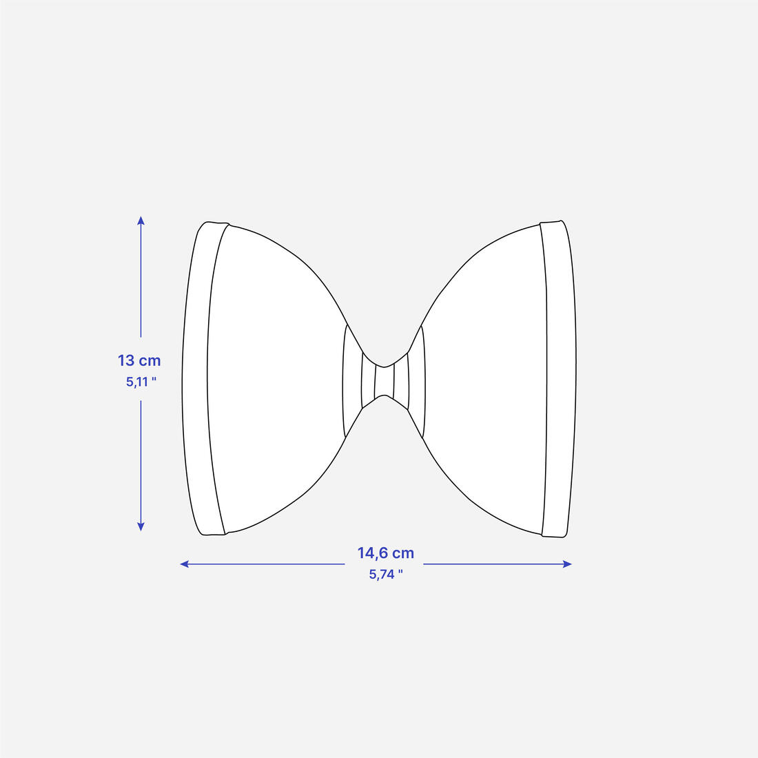 Le diabolo mesure 14,6 cm. Le diamètre de chaque calotte (les 2 parties du diabolo de part et d'autre de l'axe) est de 13 cm. Le poids du diabolo est de 228g. Le poids de chaque baguette est de 34g. Le pack comprend: un diabolo + 2 baguettes + une ficelle + 2 anneaux blancs de protection des calottes + un sac de transport.
