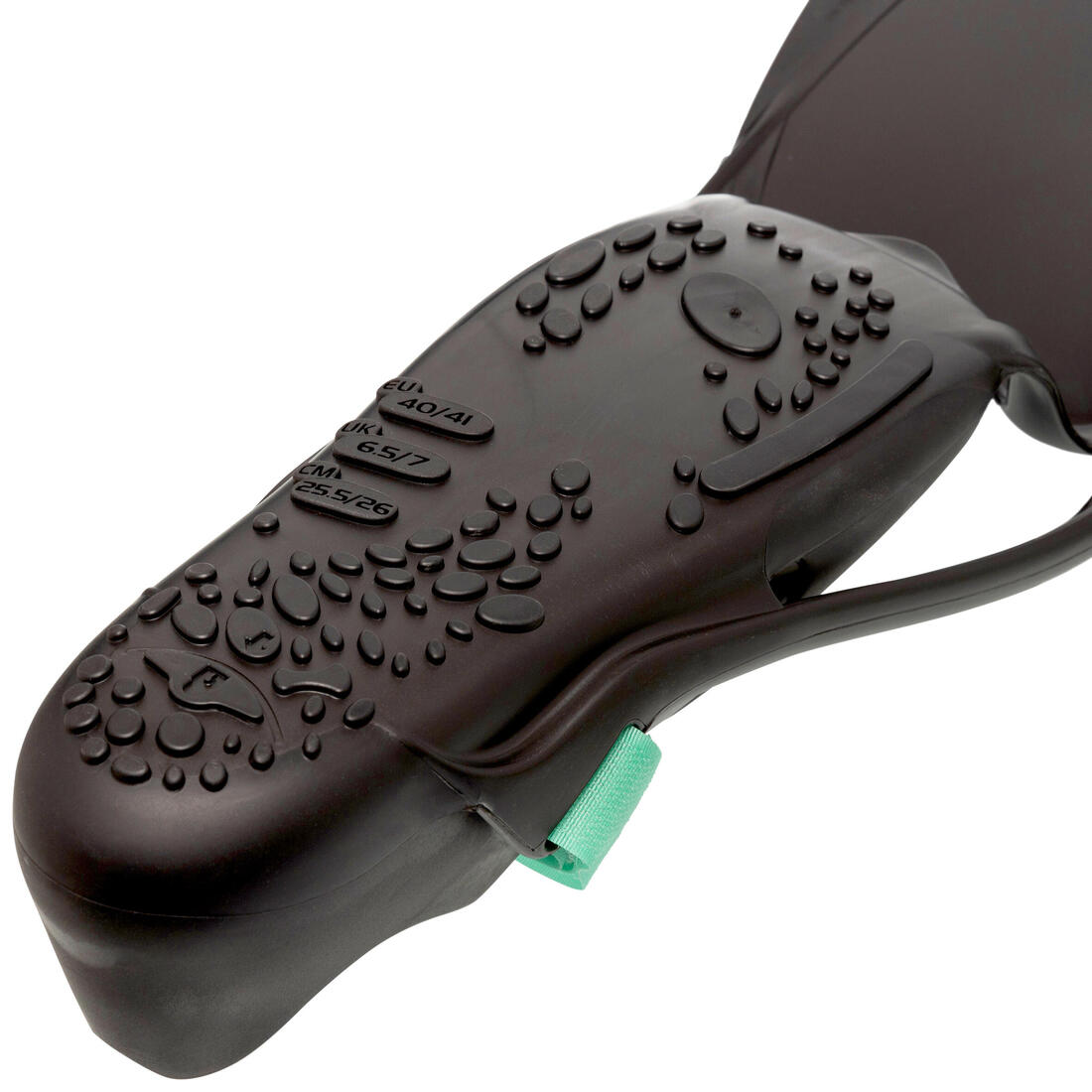 Palmes conçues spécialement pour le déplacement en surface avec un voilure déportée et un angle qui permet un palmage fluide et confortable. Le chausson propose une languette réglable avec un strap velcro ce qui permet de facilement mettre et enlever son pied de la palme comme une chaussure. Cela permet également d'ajuster parfaitement le chausson en fonction de son coup de pied (pied fort / pied fin)