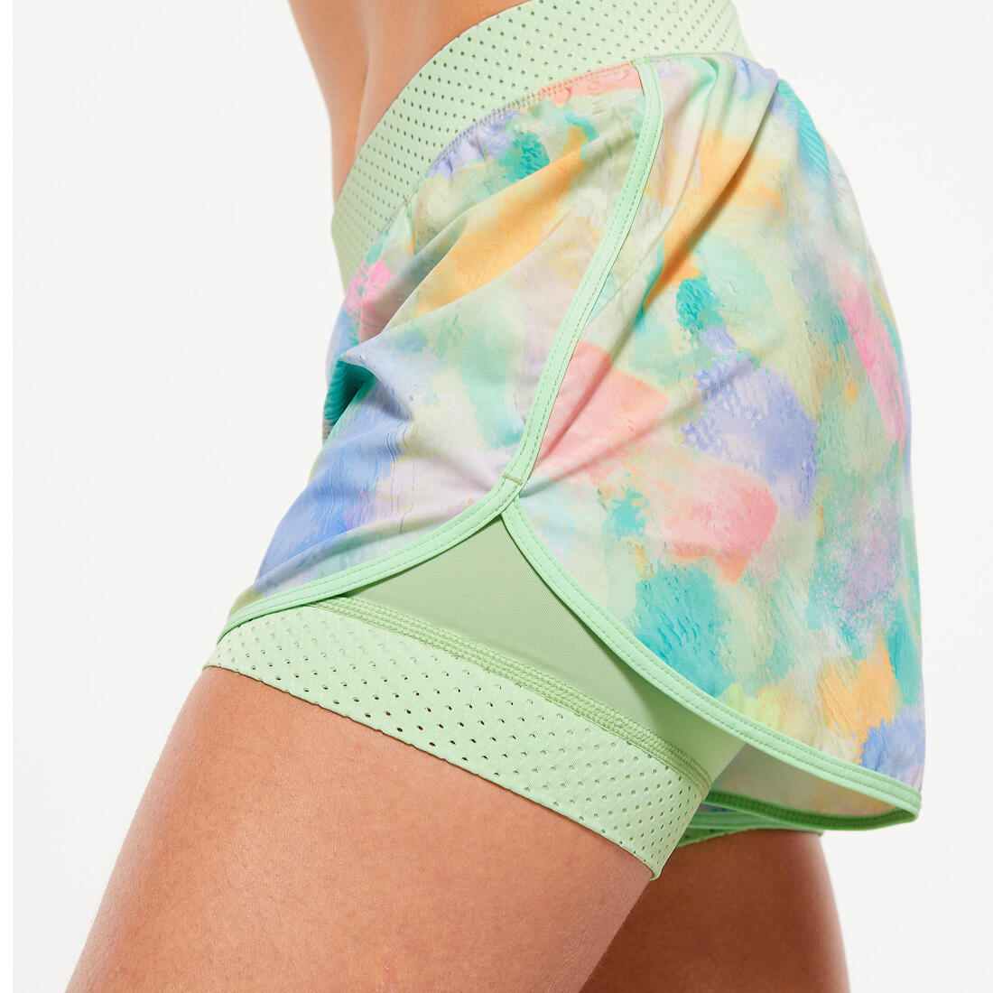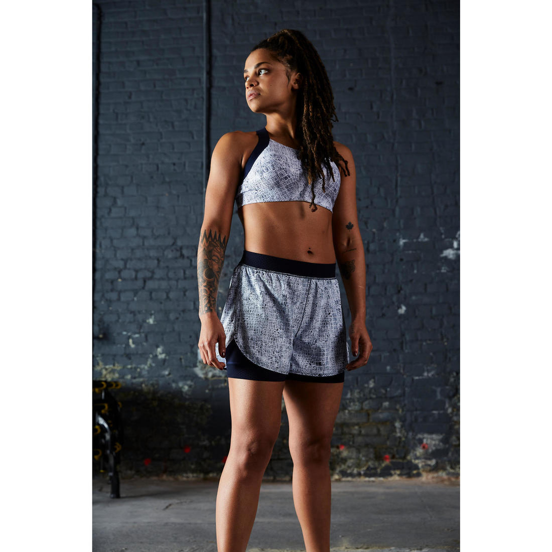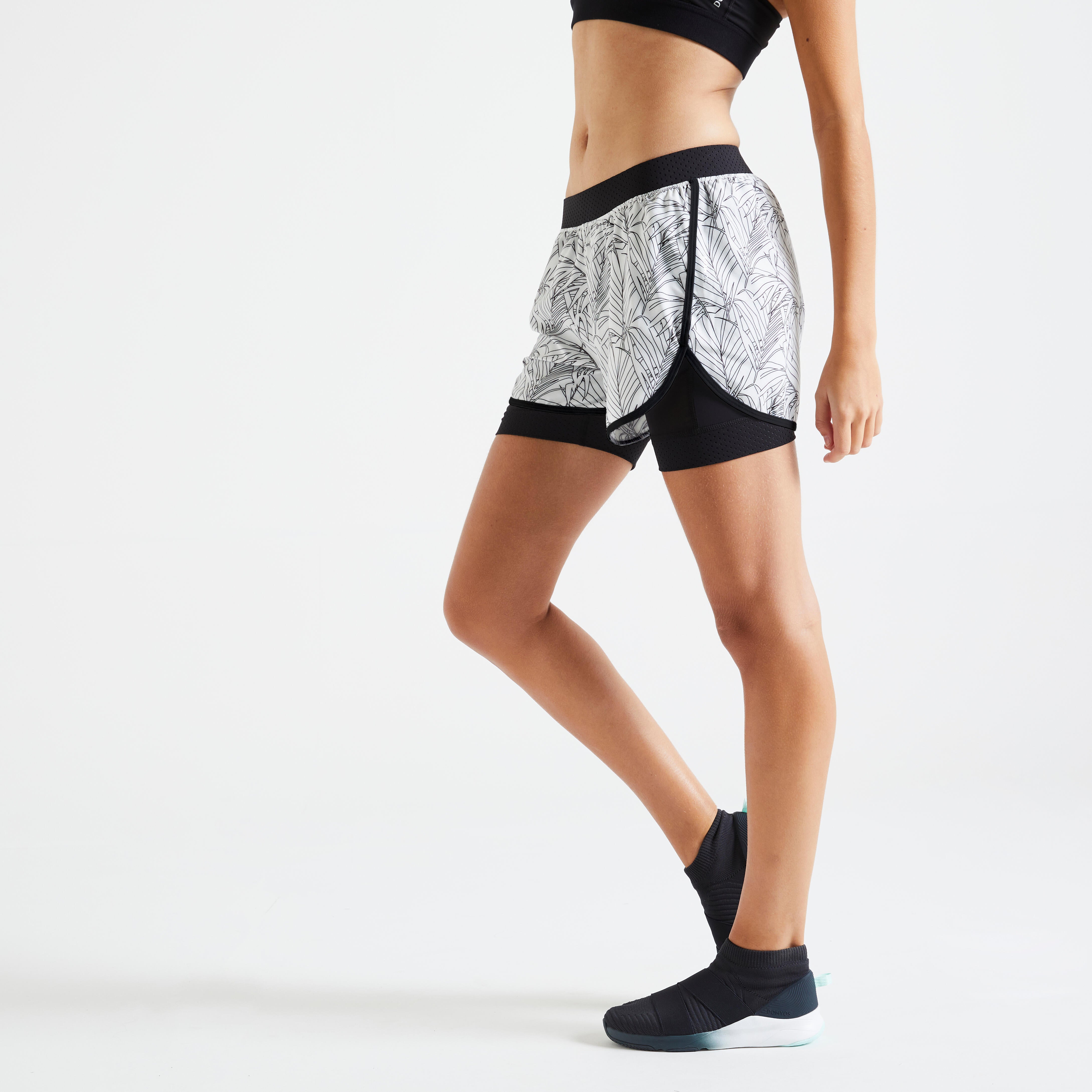 Un short fitness 2-en1 au look sportif et féminin, recommandé pour vos entraînements cardio. Bougez sans vous soucier de votre tenue !