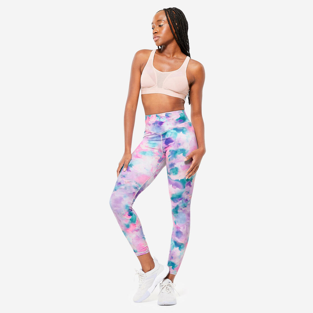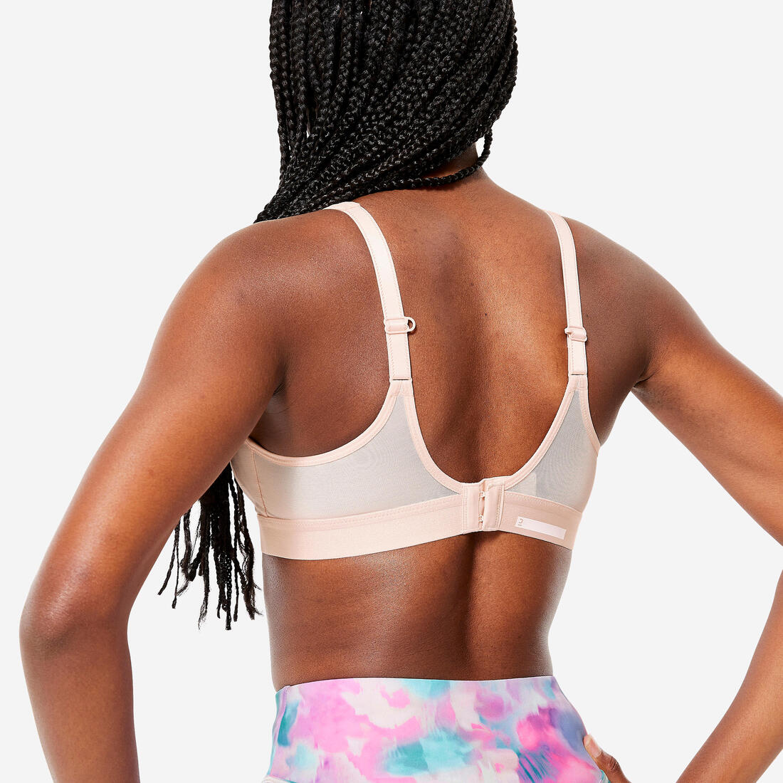Les bretelles de cette brassière de sport peuvent être croisées pour dégager les omoplates et libérer les mouvements. Une zone de respirabilité sur la poitrine permet l'évacuation de la transpiration.