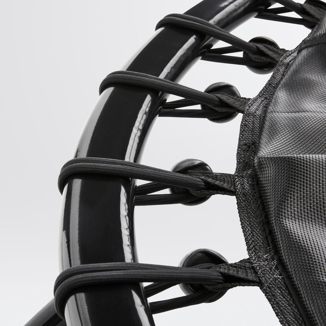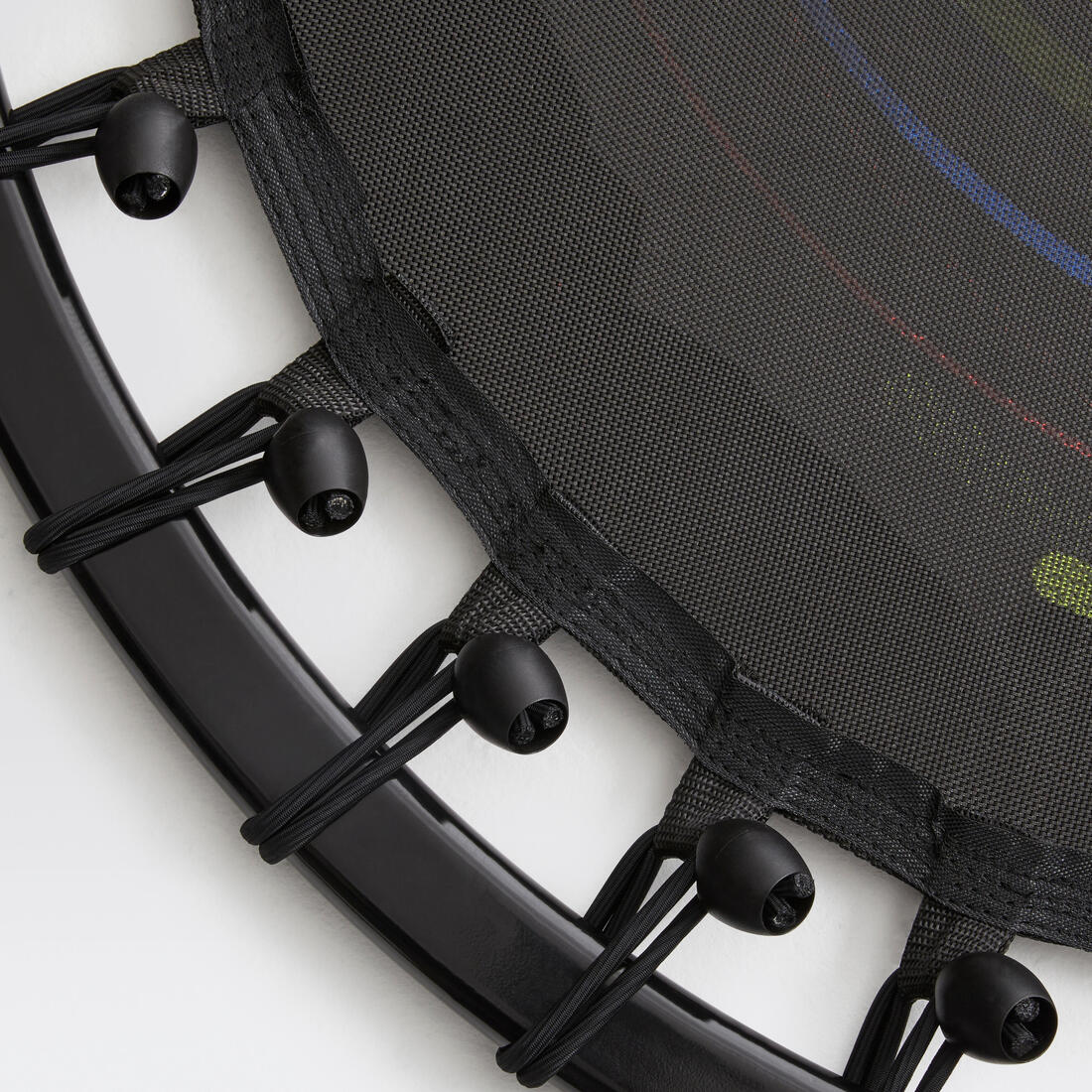Le trampoline FIT TRAMPO900 est équipé de 30 élastiques pour un rebond dynamique et silencieux. Pour une pratique en toute sécurité, les élastiques sont recouverts d'une toile synthétique.