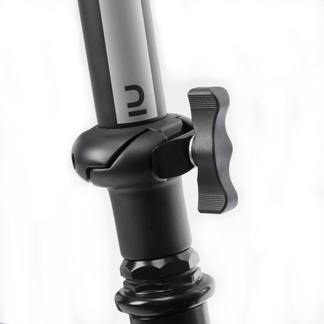 Cintre semi-relevé en acier avec un rise de 60 mm pour ajuster la position de pilotage à votre morphologie et améliorer la maniabilité du vélo. Largeur du cintre : 560 mm. Potence pliable non ajustable en aluminium, ce qui permet d'avoir une plus grande rigidité. Distance selle - cintre : 540 mm. Distance boitier de pédalier - selle : mini 520 mm - maxi 740 mm