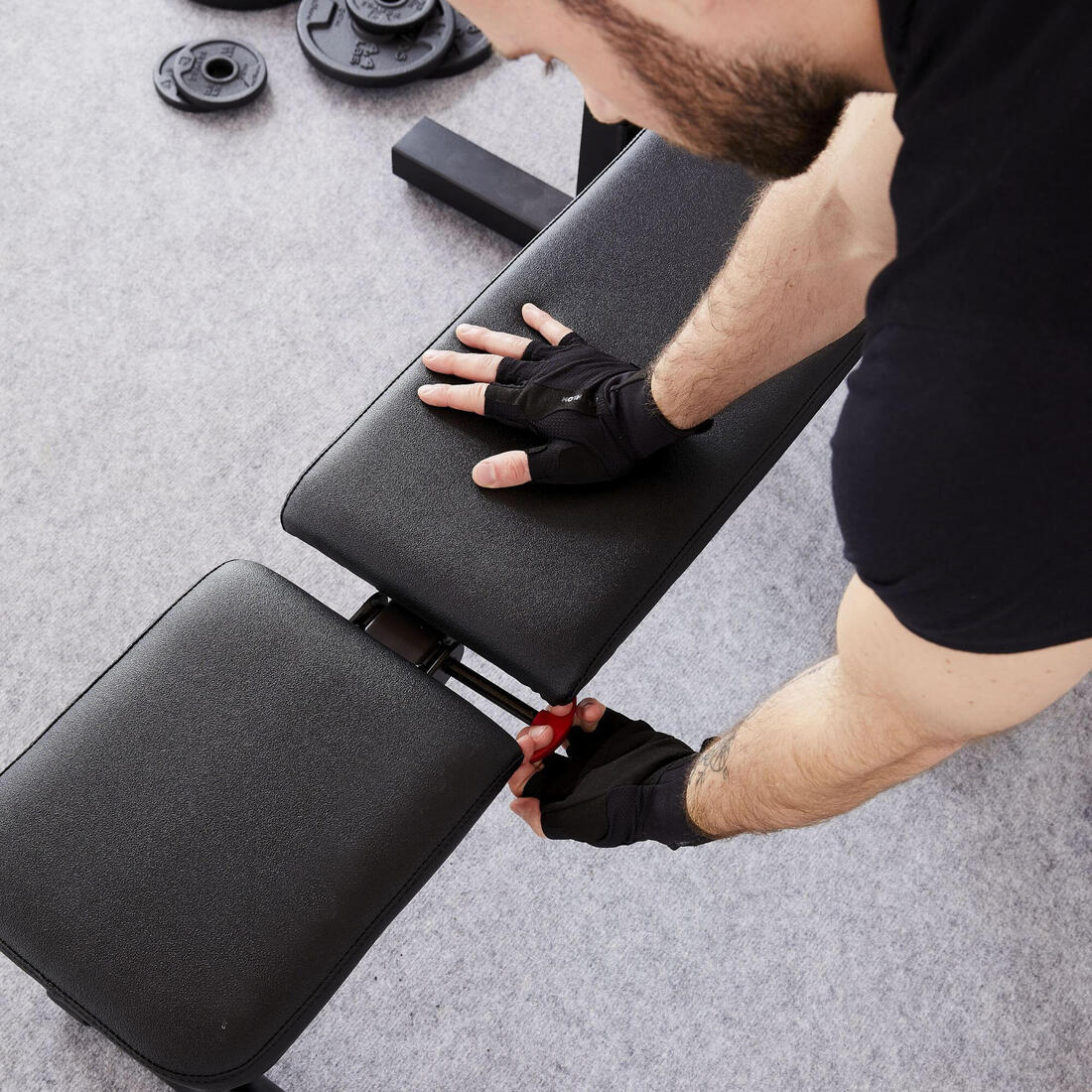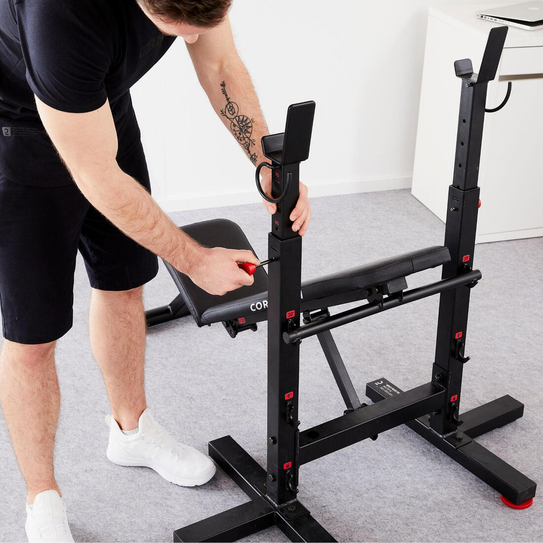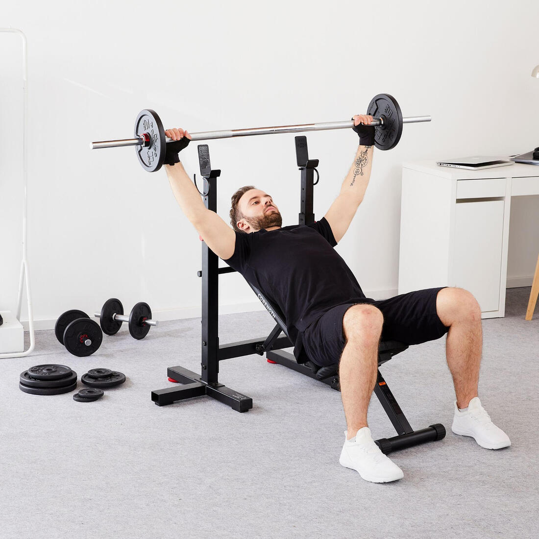 Ce banc est vendu seul, vous aurez donc besoin de vous équiper pour pratiquer. Vous aurez besoin de : - 1 barre (réf : 8289896) - Des poids (réf : 8289896) - Des stop disques (réf : 8574652) Vous pouvez aussi acheter un kit comprenant une barre, des poids et une paire d'haltères (50 kg réf : 8655649). Vous pouvez également ajouter une paire de gants (réf : 8574652)