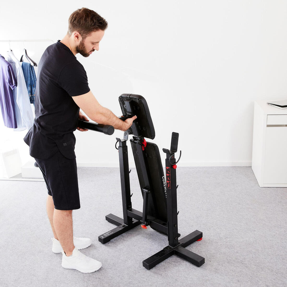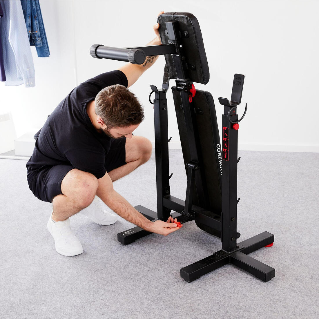 Vous pratiquez la musculation avec barre dans un petit espace? Nous avons pensé à vous, ce banc de musculation est pliable (30°) et compact. Oui, il est unique!