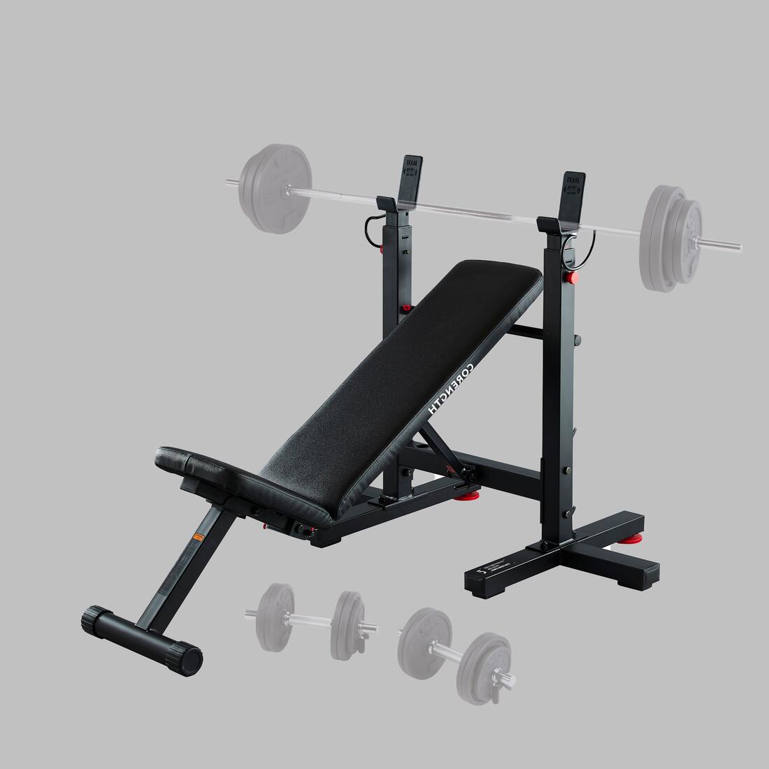 Ce banc inclinable équipé de chandelles réglables offre un grand choix d'exercices de musculation à la barre, en toute sécurité. II est stable et robuste (les chandelles supportent 100 kg).