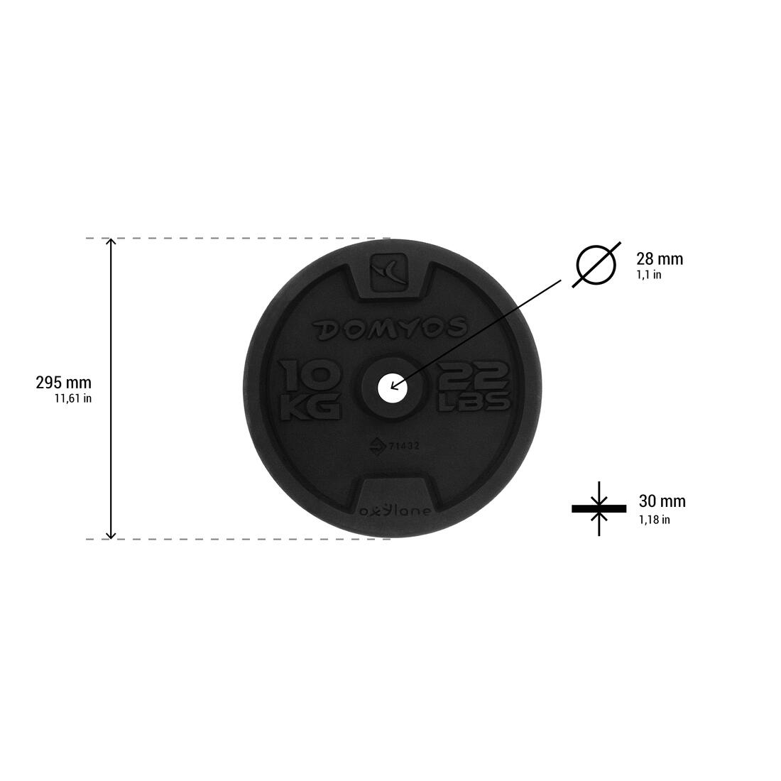 Disque de 5 kg : - Épaisseur : 24 mm - Diamètre intérieur : 28mm - Diamètre extérieur : 230 mm Disque de 10 kg : - Épaisseur : 30 mm - Diamètre intérieur : 28mm - Diamètre extérieur : 295 mm Disque de 20kg : - Épaisseur : 37 mm - Diamètre intérieur : 28mm - Diamètre extérieur : 360 mm