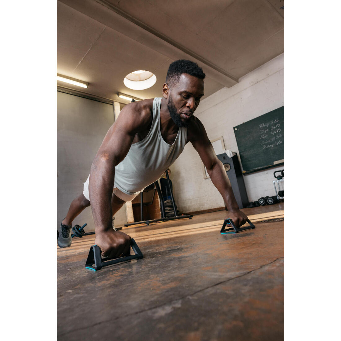 Les poignées pour pompes ont été développées par notre équipe de pratiquants pour soulager les poignets fragiles, et être plus confortables et propres que lors du contact direct avec le sol. Si vous débutez, vous limitez les risques de blessures grâce à ces poignées. Si vous avez l'habitude de faire des pompes, les poignées vous permettent d'augmenter l'amplitude de votre mouvement, car vos mains sont surélevées. Restez raisonnable pour ne pas vous blesser.