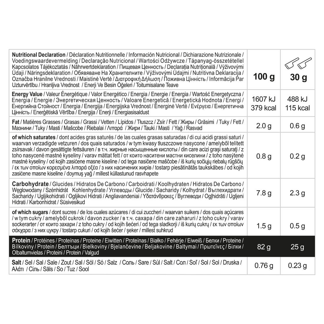 Tableau nutritionnel: 100 g | 30 g Energie: 1607 kJ | 488 kJ 379 kcal | 115 kcal Matières grasses: 2.0 g | 0.6 g dont acides gras saturés: 0.8 g | 0.2 g Glucides: 7.8 g | 2.3 g dont sucres: 1.5 g | 0.5 g Protéines: 82 g | 25 g Sel: 0.76g | 0.23 g Teneur en lactose, par shaker : environ 0,5 grammes