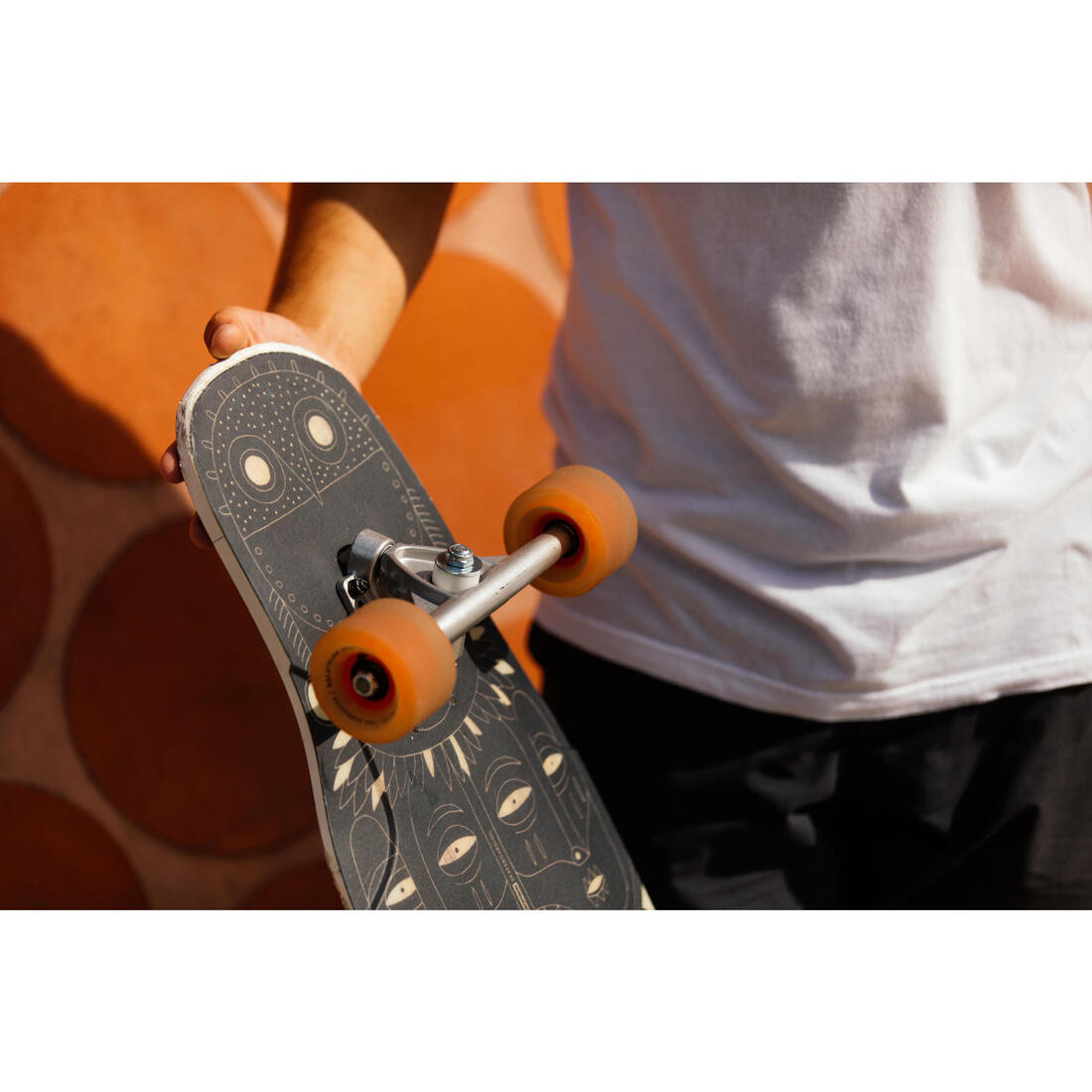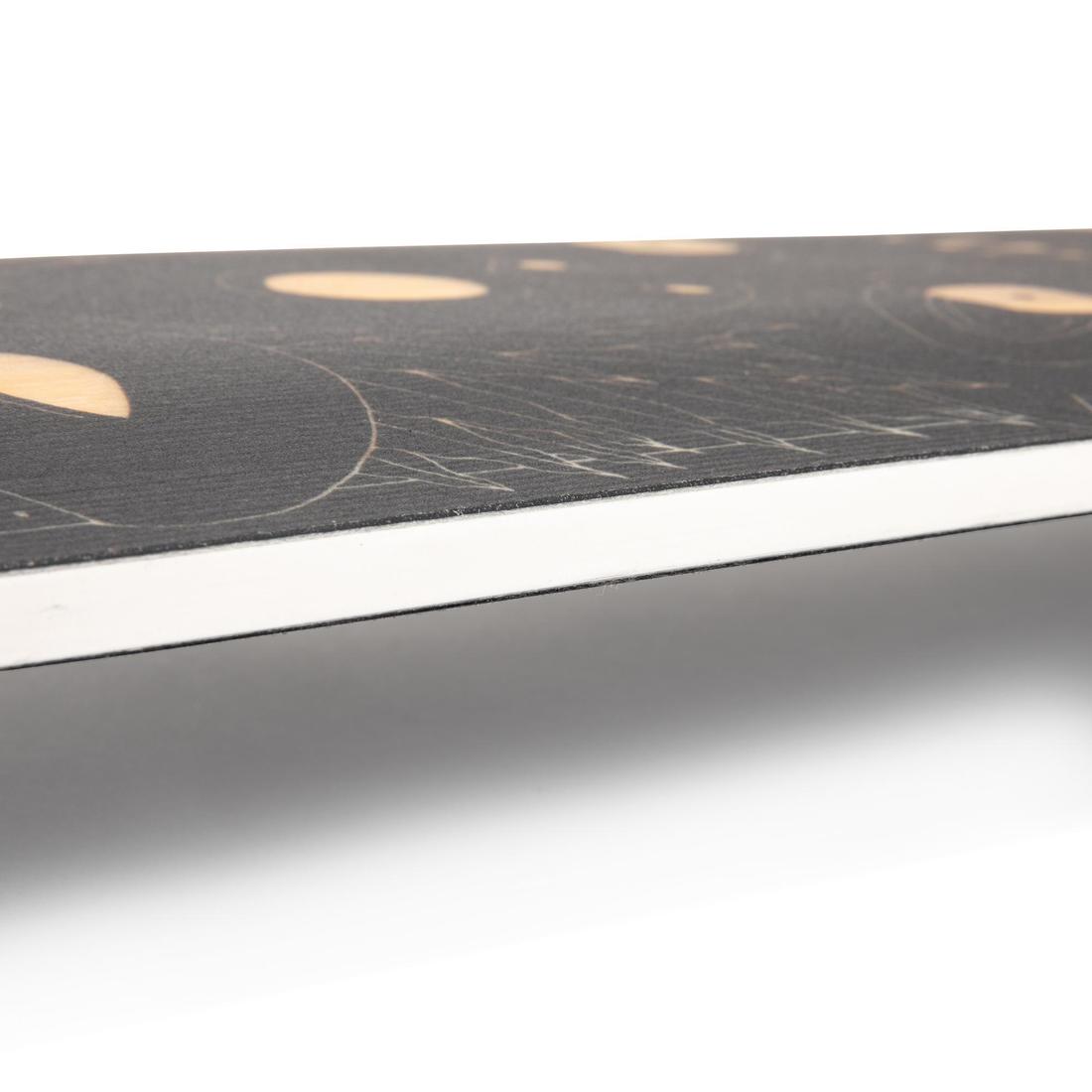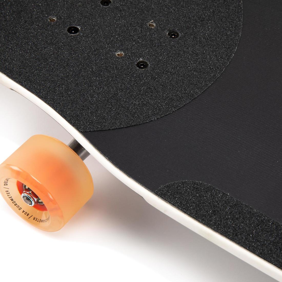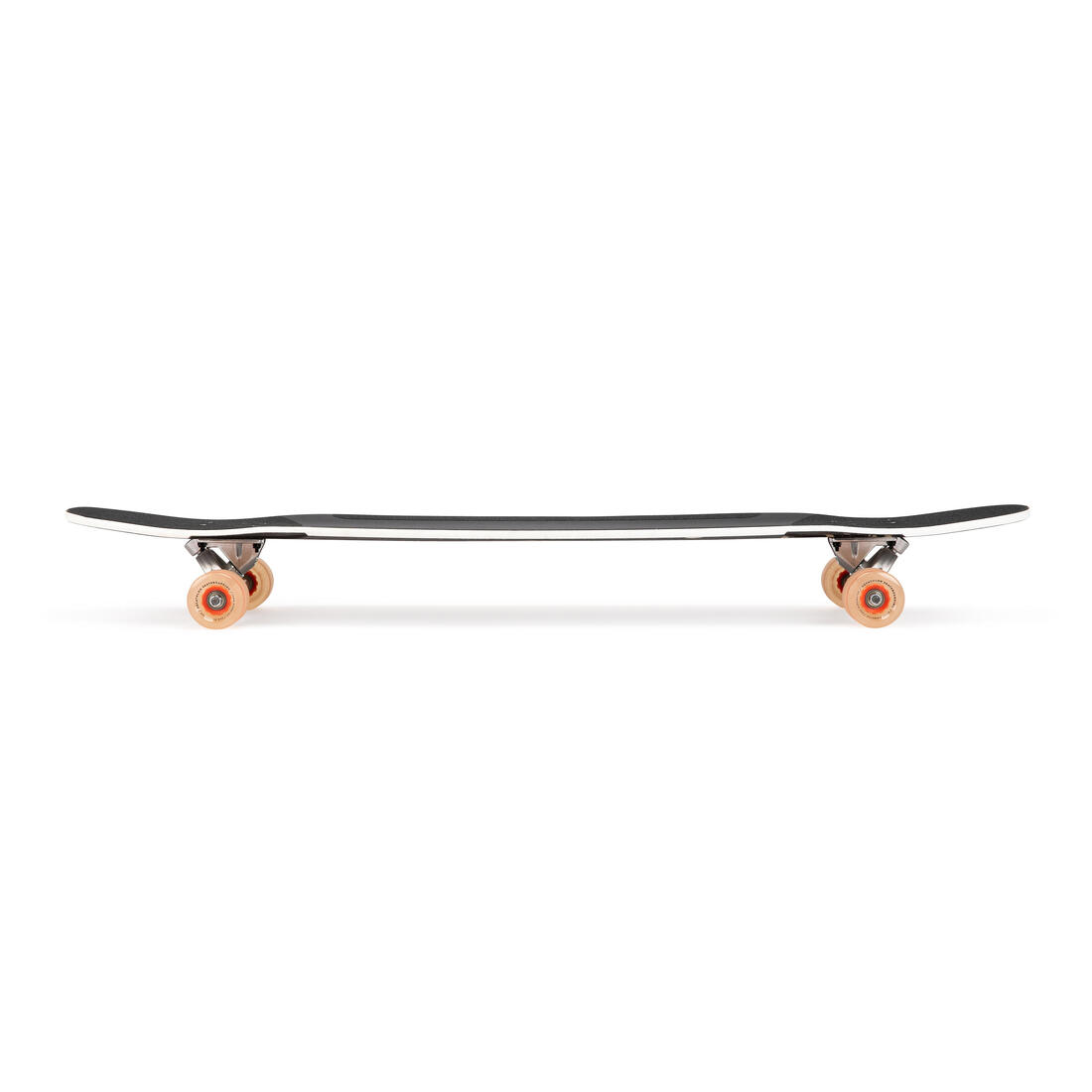 Dimensions : 112 CM X 24 CM Composition : - Planche en composite Bois (peuplier) / Fibre de verre triaxiale - Renfort fibre biaxiale nose et tail - Renfort du contour de la planche (sidewall) en TPU - Colle Epoxy Flex : 3/5 Grip découpé sur nose, tail et bordure. Sans grip au centre de la planche pour faciliter les déplacements des pieds.