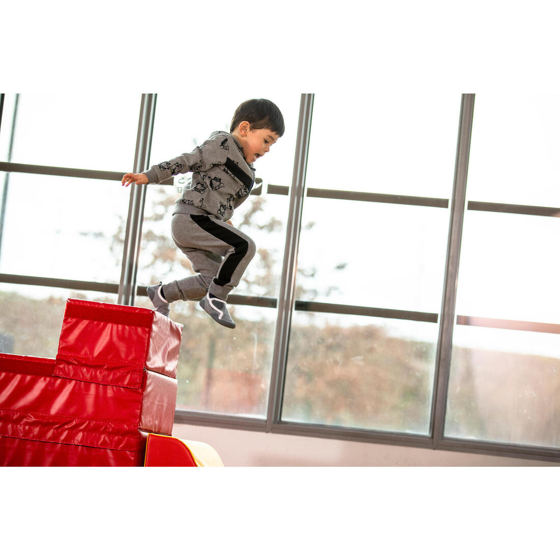 Pour être au top dans sa pratique, votre bambin a besoin d'être à l'aise dans ses vêtements, de pouvoir enlever une couche au besoin et de ne pas avoir à remonter son pantalon toutes les 5 minutes ! Optez pour une tenune souple, adaptée à la saison ou à la température du lieu de pratique : un tee-shirt et un short, ou un pantalon en maille, et une veste ou un survêtement pour s'échauffer en arrivant constituent une excellente base. Et pour éviter de glisser, une paire de chaussons Domyos !
