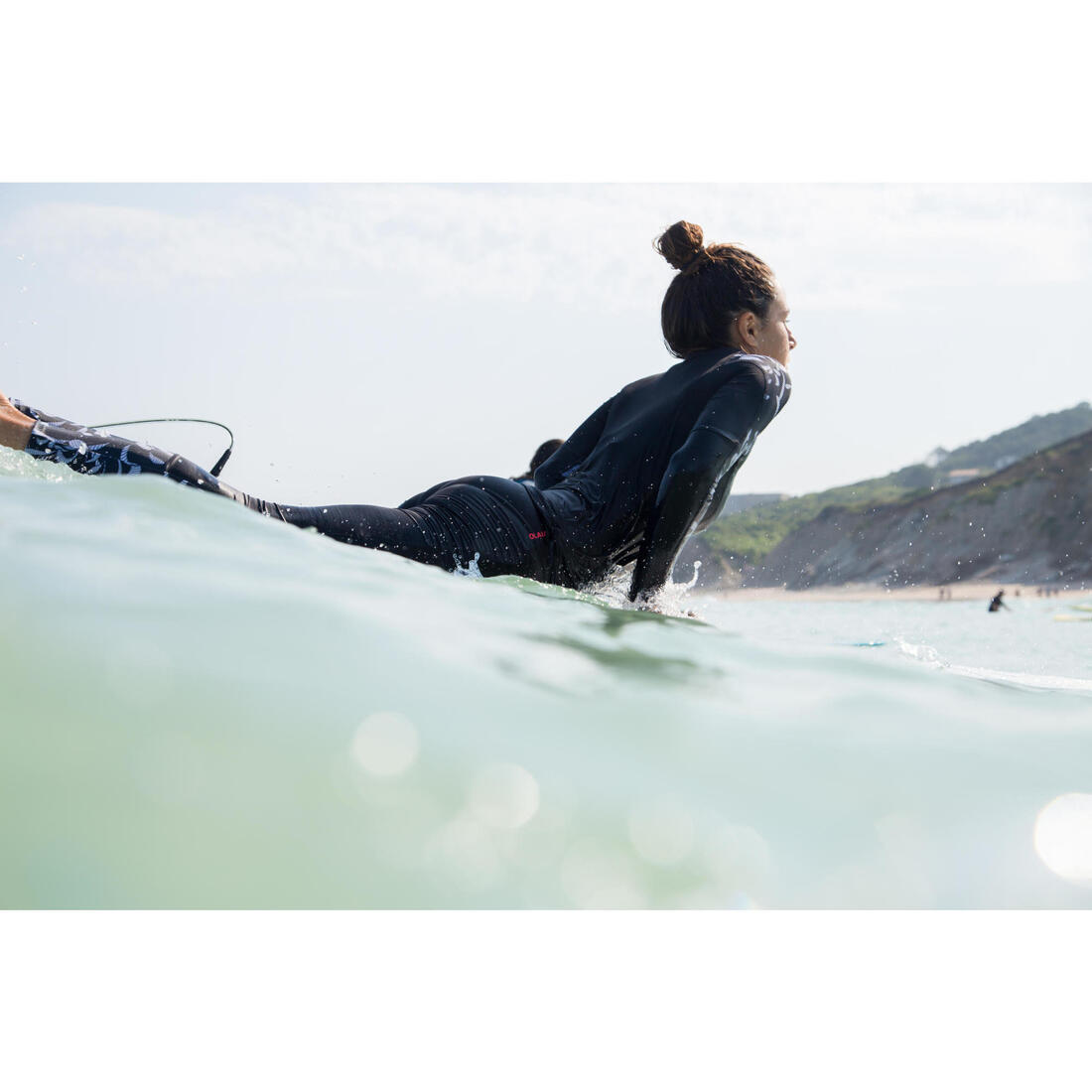 Tee shirt anti-UV manches longues pour protéger du soleil, même dans l'eau, et limiter les irritations au contact de la planche. Nœuds latéraux d'attache du maillot pour la tenue dans la vague.