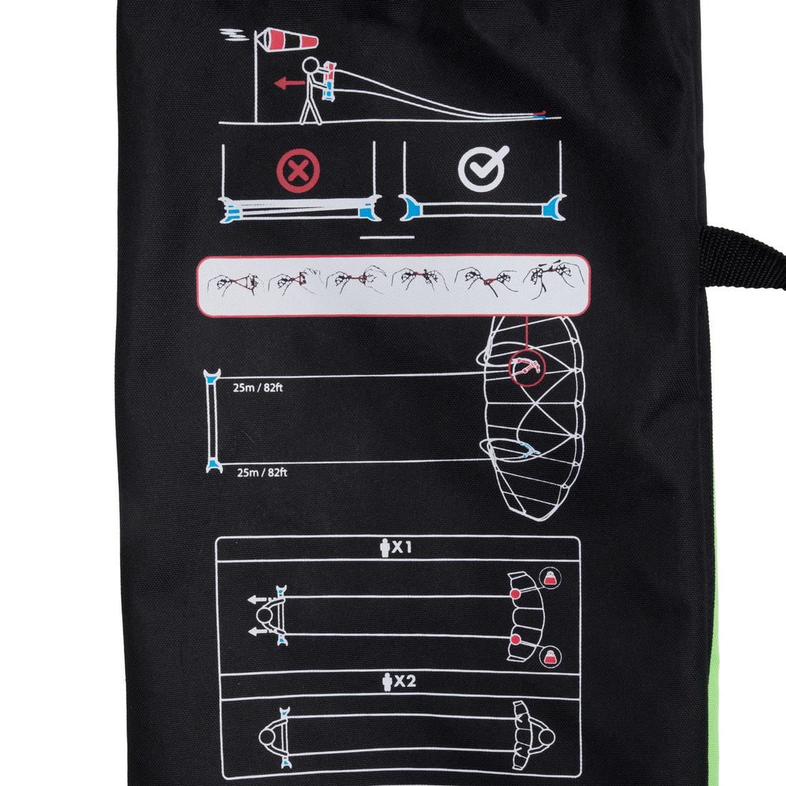 L'aile est livrée avec une barre de contrôle qui facilite le pilotage. Sa mise en oeuvre est simple: Déroulez les lignes, posez l'aile en bout de ligne sur le dos, mettez du sable dessus, et enfin connectez les lignes. Avant de décoller l'aile, fixez le leash de sécurité sur votre poignet, tirez d'un coup sec sur l'aile...c'est parti !