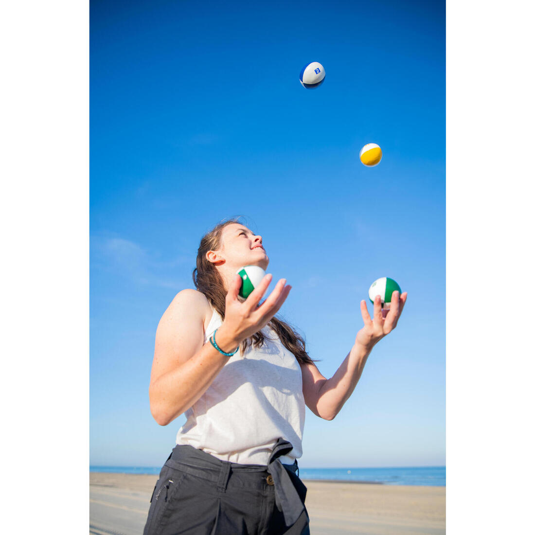Pour pratiquer la jonglerie, le jongleur doit avoir des balles adaptées à son niveau, à ses mains et sa musculature. Les balles sacs seront adaptées aux jongleurs débutants et à l'entrainement (en intérieur). Le diamètre de la balle dépendra de la taille de main du jongleur et du nombre de balles avec lesquelles il souhaite jongler. Et le poids dépendra de sa musculature. Vous pouvez consulter nos vidéos de conseils et d'apprentissage sur la chaine YouTube DECATHLON Gymnastics.