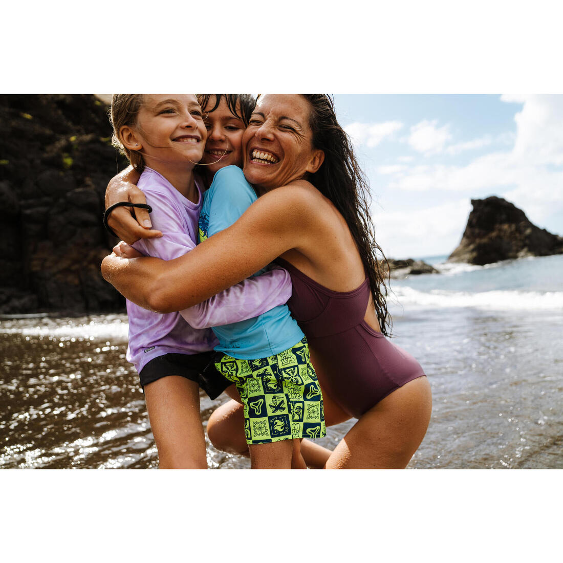 Le slip intérieur de ce maillot de bain remplit à la fois un rôle de maintien et un rôle hygiénique. Son composant 100 % polyester, composé de mailles fines et de trous d'évacuation, laisse partir l'eau et le sable, sans risques pour l'enfant.