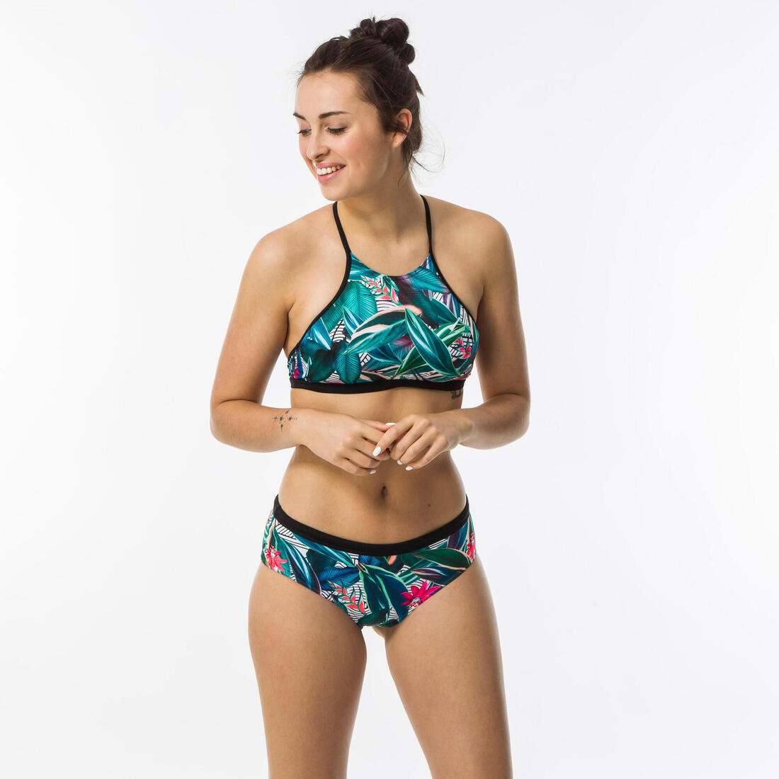 Avec son allure très sport, la brassière ANDREA couvre complètement la poitrine et joue avec les imprimés. Les épaules sont bien dégagées, parfait pour la pratique du surf ou du stand up paddle. Le dos quant à lui est totalement ouvert, de fines bretelles croisées et réglables permettent une bonne stabilité de la brassière dans les mouvements. La poitrine est bien contenue mais le maintien est modéré, cette brassière convient mieux aux petites poitrines. Contient des coques amovibles.