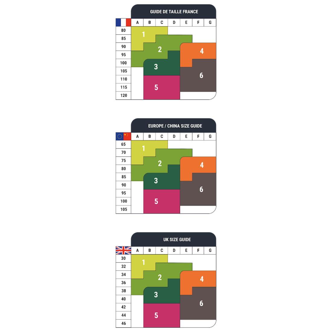 Une manière inédite de lire les tailles. Trouver votre taille sera + facile et + rapide : seulement 6 tailles qui couvrent 50 tailles de poitrines. 6 = 50. Disponible en 6 tailles, du 85A au 115G. Consultez la grille de tailles présente en photo ou cliquez sur notre guide des tailles.